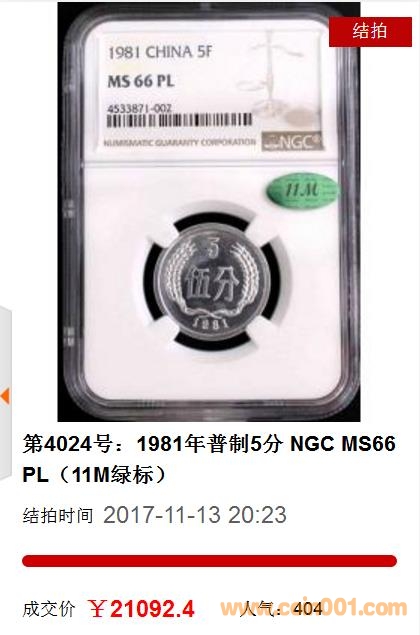 ????本場(chǎng)次還有一大亮點(diǎn),就是經(jīng)過(guò)11M再評(píng)級(jí)的錢(qián)幣受到追捧,例如第4024號(hào):1981年普制5分 NGC MS66PL(11M綠標(biāo)),以