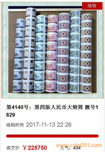 262500元的價(jià)格成交;第4140號(hào):第四版人民幣大炮筒,靚號(hào)1629,最終成交價(jià)格