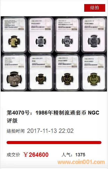 3622元成交,讓人眼前一亮;第4070號(hào)拍品:1986年精制流通套幣 NGC評(píng)級(jí),雖然評(píng)級(jí)分?jǐn)?shù)整體比夏拍那套低一些,但是仍為本場(chǎng)最大亮點(diǎn),但在經(jīng)過(guò)53次競(jìng)價(jià)之后,最終以