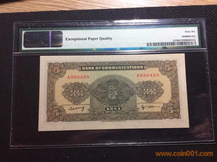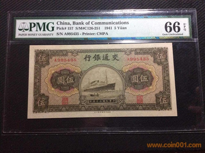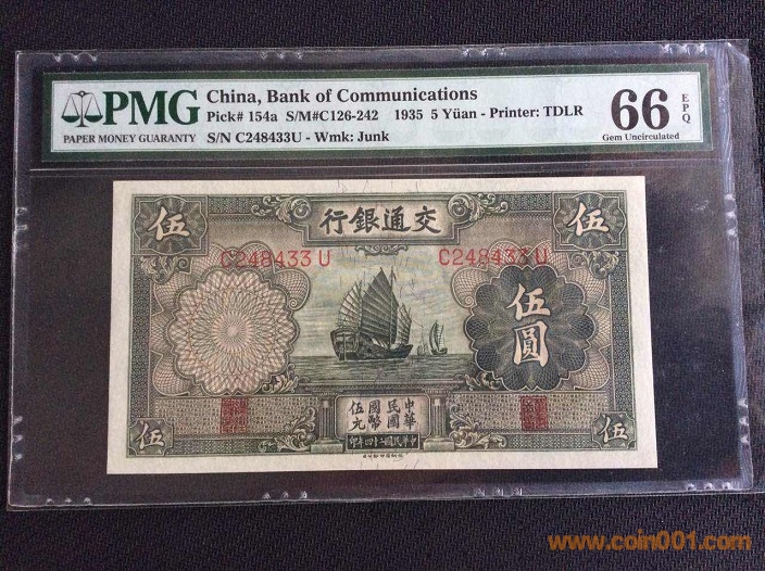 15、交通銀行5元大帆船(1935年) PMG66E 248434# ¥530