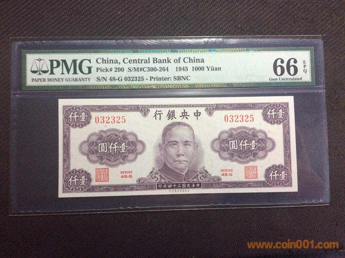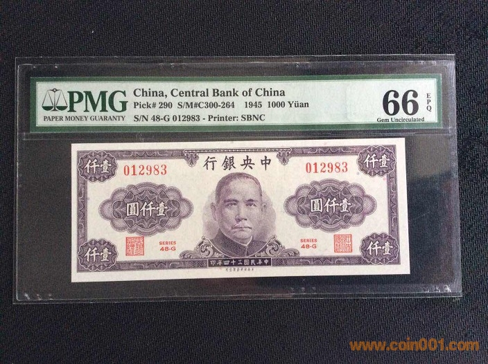 11、中央銀行1000元(1945年) PMG66E 012983# ¥300
