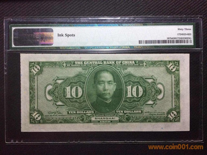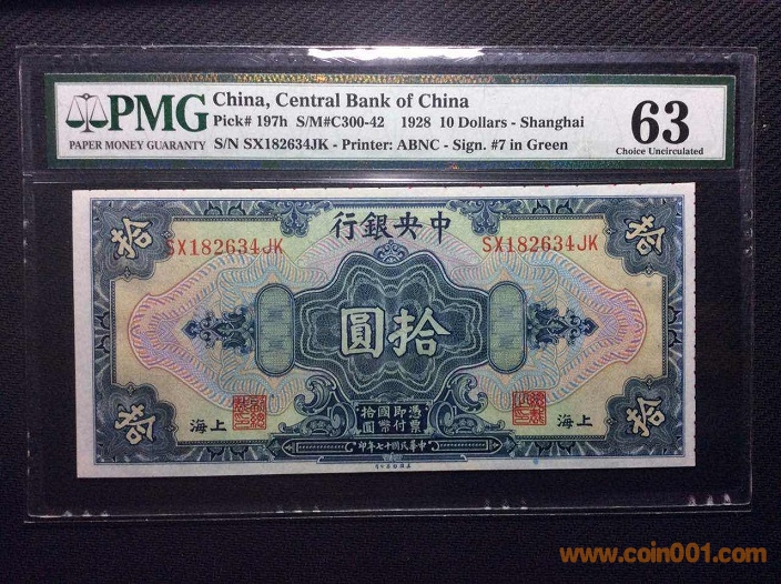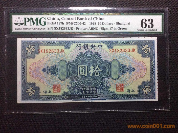 7、中央銀行10元加蓋上海地名(1928年) PMG63 182633# ¥260 注:趣味鈔,裁切跑偏鈔紙有印刷色標(biāo),評級標(biāo)簽有備注