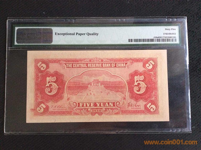 2、中央儲備銀行5元(1940年) PMG65E 130047# ¥360