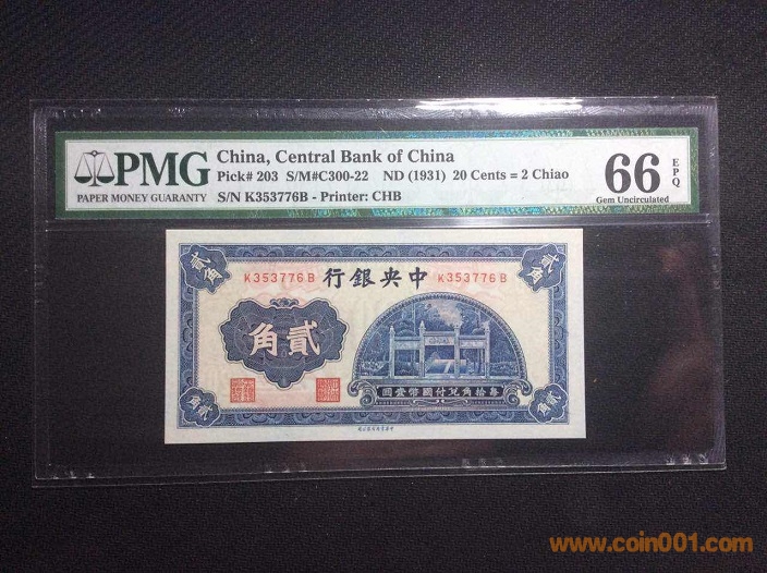 3、中央銀行杏壇1角(1931年) PMG66E 433962# ¥290