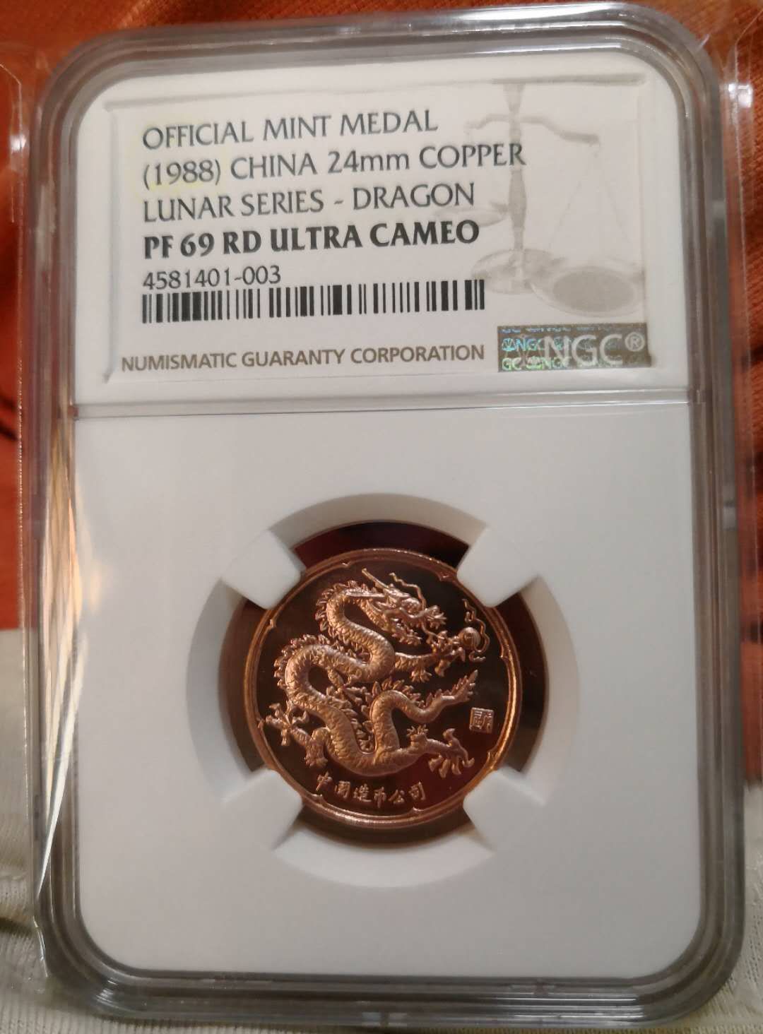 3. 1988年24毫米紫銅生肖龍紀念章PF69RDUC,個人覺得這個章絕大部分噴砂和鏡面都不夠好,加上目前NGC給后綴控制很嚴,出69UC已經(jīng)十分難了。目前69UC才18枚,沒記錯的話去年年初就是這個數(shù)字,平時上拍69UC難見,錯過難追。一口價3500元……