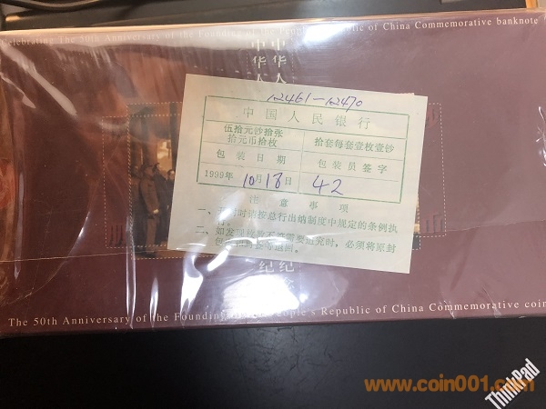 建國(guó)50周年紀(jì)念鈔配紅卡裝幀十連號(hào)(J01012461-J01012460)