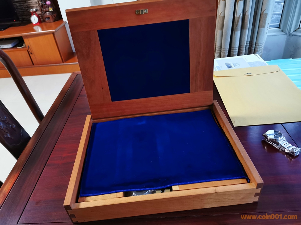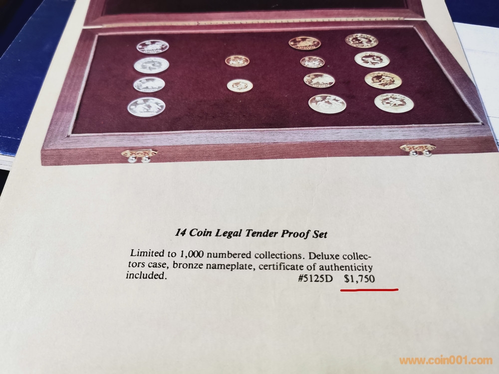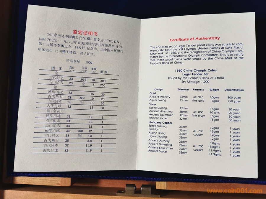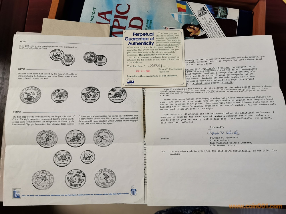 美國版證書就比較奇怪了。根據(jù)克書記載,1980年由中國造幣公司官方正式裝幀發(fā)行的中冬奧系列精制幣套裝一共有4種,一是金銀銅14枚大全套,發(fā)行量1000套。二是中奧銅幣4枚裝一套,發(fā)行量不詳。三是冬奧銅幣4枚裝一套,發(fā)行量不詳。四是中奧銀幣3枚盒裝一套,發(fā)行量1000套。并無記載有中冬奧8枚一起發(fā)行的套裝,因此這張證書存疑。