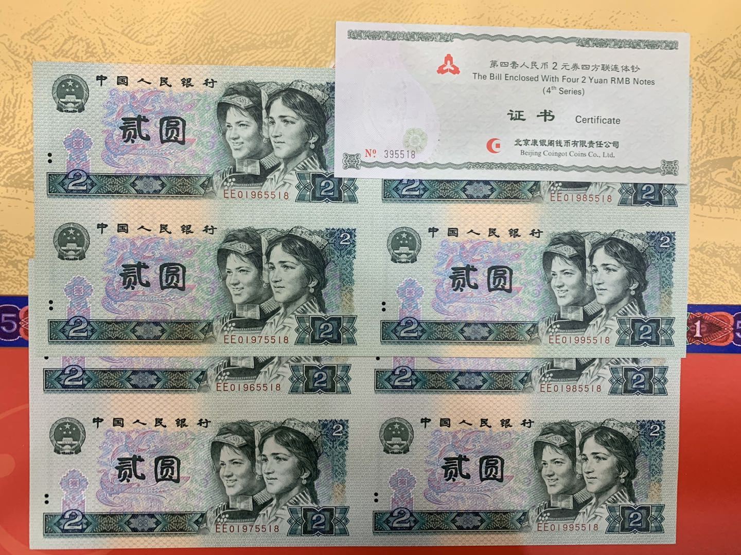 第四套人民幣2元四方連體鈔 8090年一套