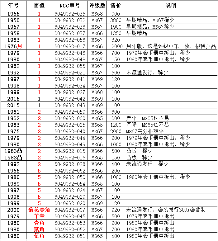 年號(hào) 面值 NGC串號(hào) 評(píng)級(jí)數(shù) 售價(jià) 說明 1955 1 6049932-035 MS68 900 1956 1 6049932-032 MS67 3800 早期精品,MS67稀少 1957 1 6049932-038 MS67 1900 早期精品,MS67稀少 1958 1 6049932-037 MS66 1350 早期精品 1963 1 6049932-056 MS67 320 1976月牙 1 6049932-017 MS66 12000 月牙版,這是評(píng)級(jí)中第一枚,極稀少品 1979 1 6049932-046 MS66 700 1979年套幣冊(cè)中拆出,稀少 1980 1 6049932-048 MS67 150 1980年套幣冊(cè)中拆出,稀少 1982 1 6049932-055 MS67 100 1992 1 6049932-021 MS67 500 未流通發(fā)行,稀少 1997 1 6049932-041 MS69 120 1998 1 6049932-034 MS67 100 1999 1 6049932-027 MS68 100 2015 1 6049932-042 MS69 100 2015 1 6049932-043 MS69 100 1961 2 6049932-059 MS66 600 1962 2 6049932-060 MS65 600 嚴(yán)評(píng),MS65也不易 1963 2 6049932-025 MS65 1200 嚴(yán)評(píng),MS65也不易 1975 2 6049932-040 MS67 2000 MS67高分很難評(píng) 1979 2 6049932-044 MS66 200 1979年套幣冊(cè)中拆出,稀少 1980 2 6049932-049 MS66 1000 1980年套幣冊(cè)中拆出,稀少 1983凸 2 6049932-015 MS66 500 凸版,稀少 1983凸 2 6049932-016 MS65 150 凸版,稀少 1992 2 6049932-028 MS66 400 未流通發(fā)行,稀少 1955 5 6049932-062 MS66 200 1980 5 6049932-050 MS66 1000 1980年套幣冊(cè)中拆出,稀少 1989 5 6049932-054 MS65 100 1997 5 6049932-024 MS67 100 1998 5 6049932-029 MS67 100 1999 5 6049932-020 MS69 120 2000 菊花壹角 6049932-007 MS66 920 未流通發(fā)行,套裝發(fā)行30萬套普制 1979 羊章 6049932-045 MS66 500 1979年套幣冊(cè)中拆出 1980 壹角 6049932-053 MS66 200 1980年套幣冊(cè)中拆出 1980 貳角 6049932-052 MS67 700 1980年套幣冊(cè)中拆出 1980 伍角 6049932-051 MS65 400 1980年套幣冊(cè)中拆出