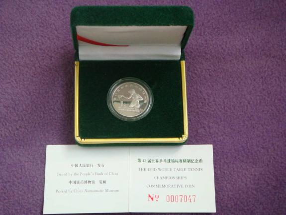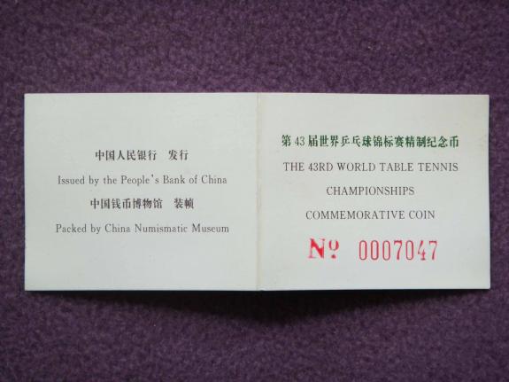 證書(shū)號(hào)碼7047,幣全品,塑盒少碰,外邊白色紙包裝盒少舊、有開(kāi)膠(世乒賽包裝盒都開(kāi)膠),
