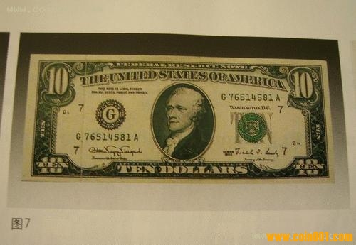 圖7、8所示為美元10元殘幣。這張美鈔的左側存在明顯的折痕,折痕展開后可見印刷空白,也系紙張折疊所致。