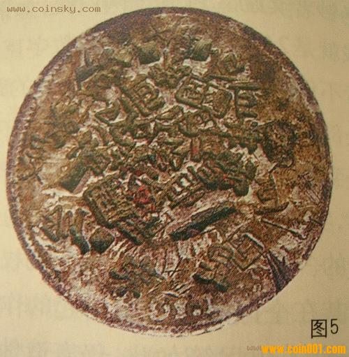 圖3所示為“‘餉’字錯版銀幣”。清光緒三十三年(1907年)新疆鑄造“餉銀”錢幣。其中一種正面珠圈內為漢文“餉銀五錢”4字,珠圈外為維文“餉銀五錢”,背面為線圈蟠龍,左右各有一小花。該幣正面漢文“餉”字的“食”旁少了最后一筆,成為“餉”字錯版。