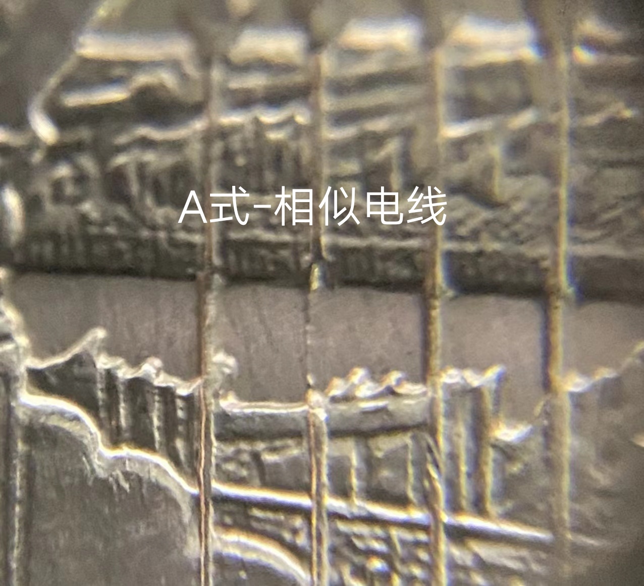 如果把錢幣擺成45度方向看,還是隱隱約約有條線狀,我與評級公司溝通,他們提供的高清照片是能看出線的,但不太完整了,是斷斷續(xù)續(xù)的,所以與“桿子沒了,電線還在”那種在性質上是一樣的,也可以叫話筒細線或話筒細桿。但總的情況,是話筒的桿子缺失并與另外三支話筒桿子形成明顯的異樣,我覺得愛藏評級最后仍然采用我最早的“話筒斷桿”,是恰如其分的,可以涵蓋其中若干種的小狀況。包括愛藏最先推出的1985年老西藏“雙柱版”,其實這個雙柱也是漸次由粗變細的,最細的需要使用放大鏡,是可見非常細微的雙柱的。