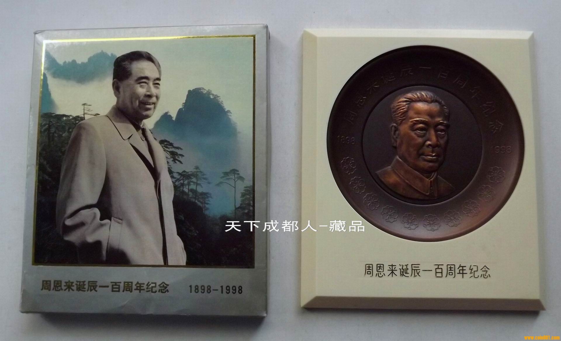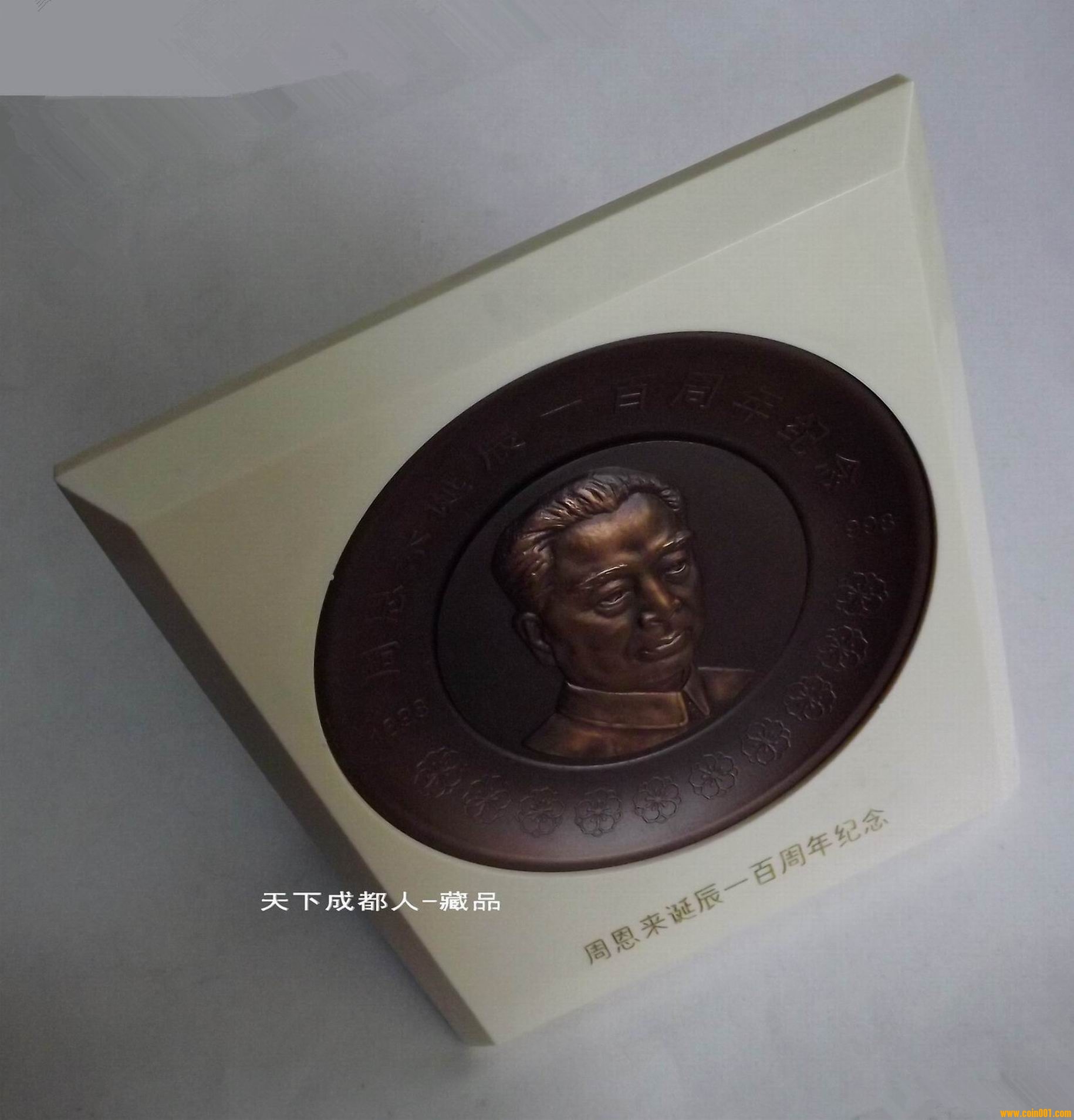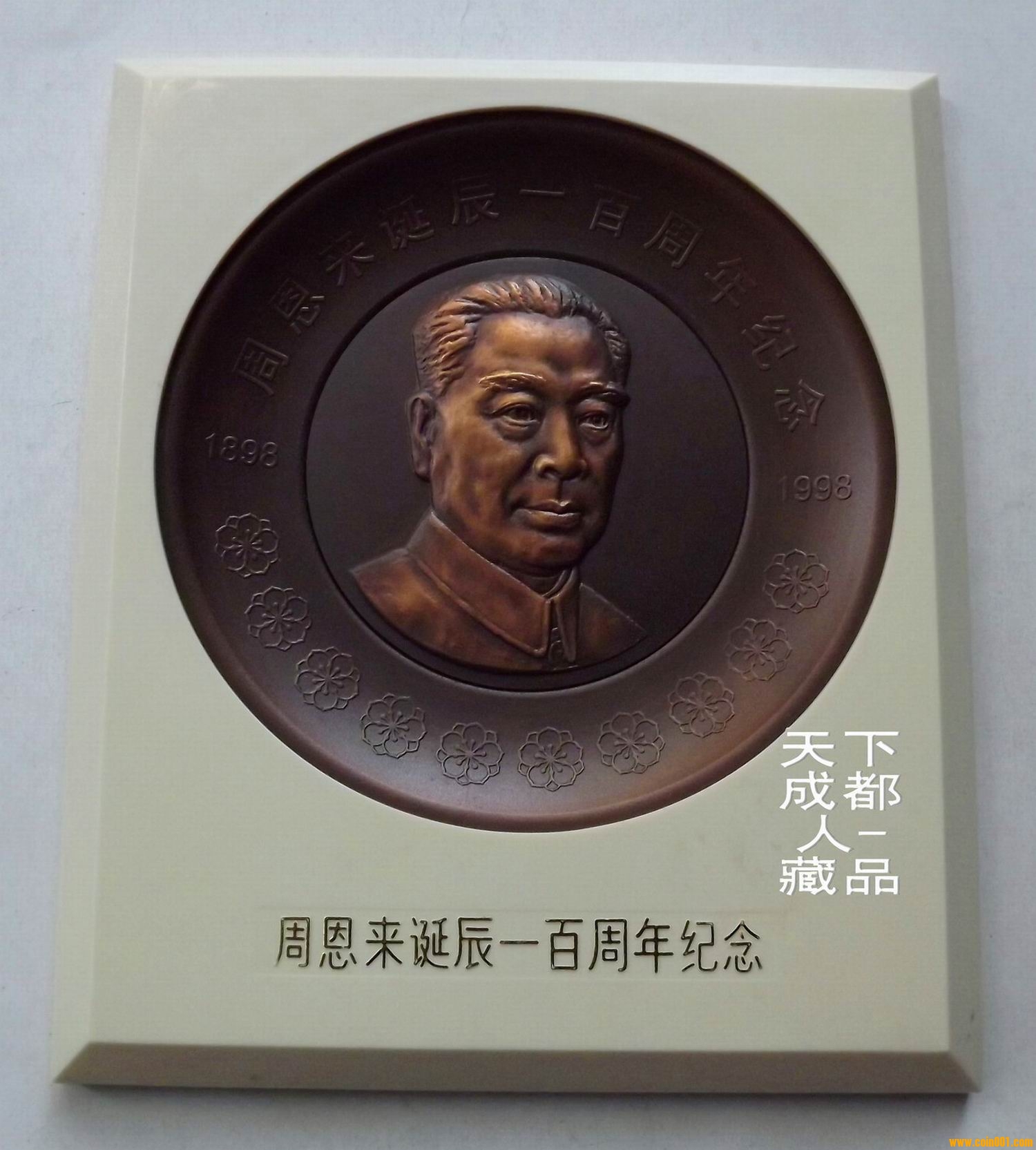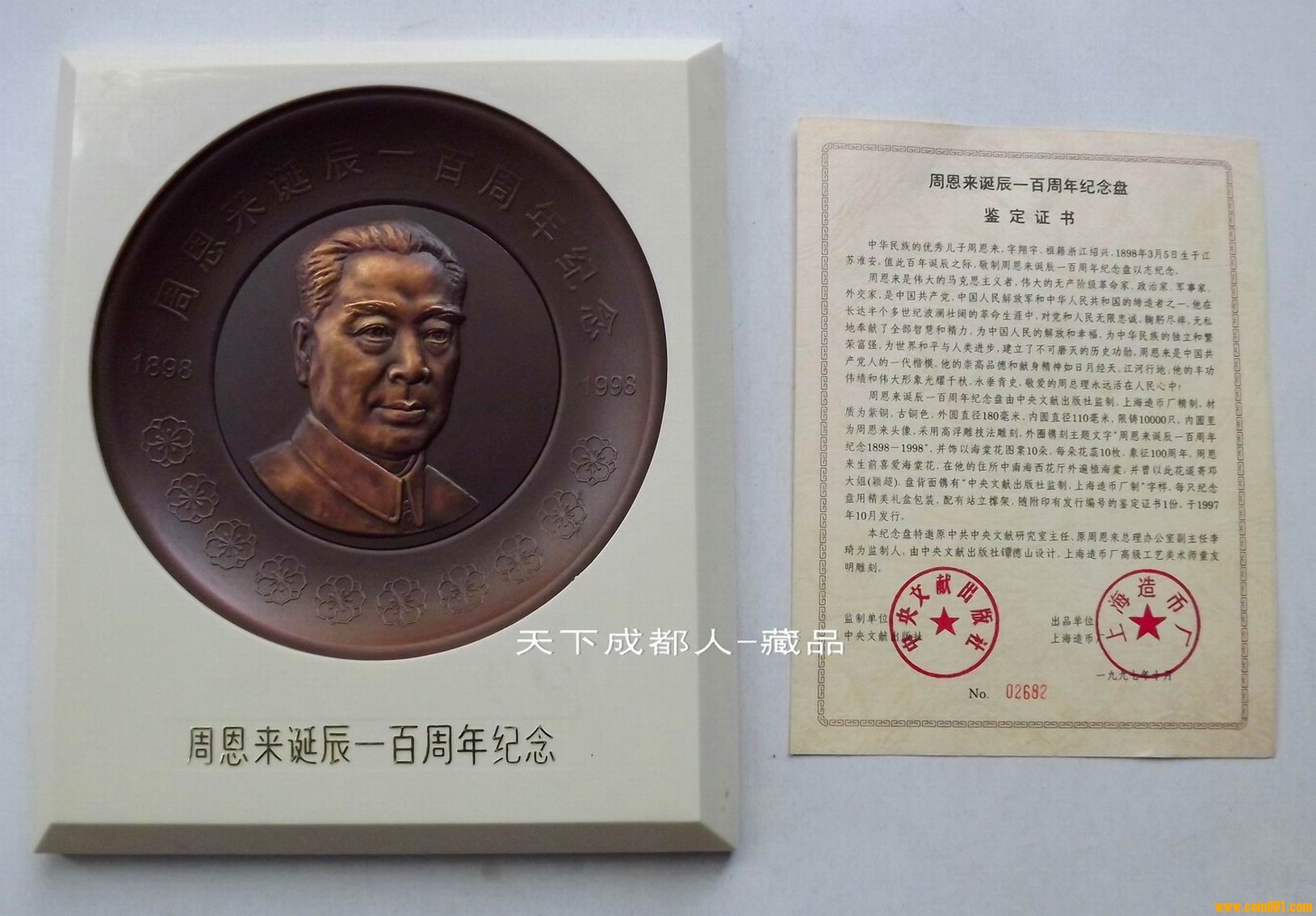 該大銅章紀(jì)念盤正面圖案內(nèi)圓為周恩來頭像,外緣鐫刻主題文字“周恩來誕辰一百周年紀(jì)念1898-1998”字樣,并飾以海棠花圖案10朵,每朵花蕊10枚,象征100周年(周恩來生前最愛海棠花,在他住所中南海西花廳外遍植海棠,并曾以此花遙思鄧大姐)。盤背面鐫刻“中央文獻(xiàn)出版社監(jiān)制,上海造幣廠制”字樣。上幣原淡黃色像框盒精美包裝,配站立支架1個,隨附印有發(fā)行編號鑒定證書1份 。