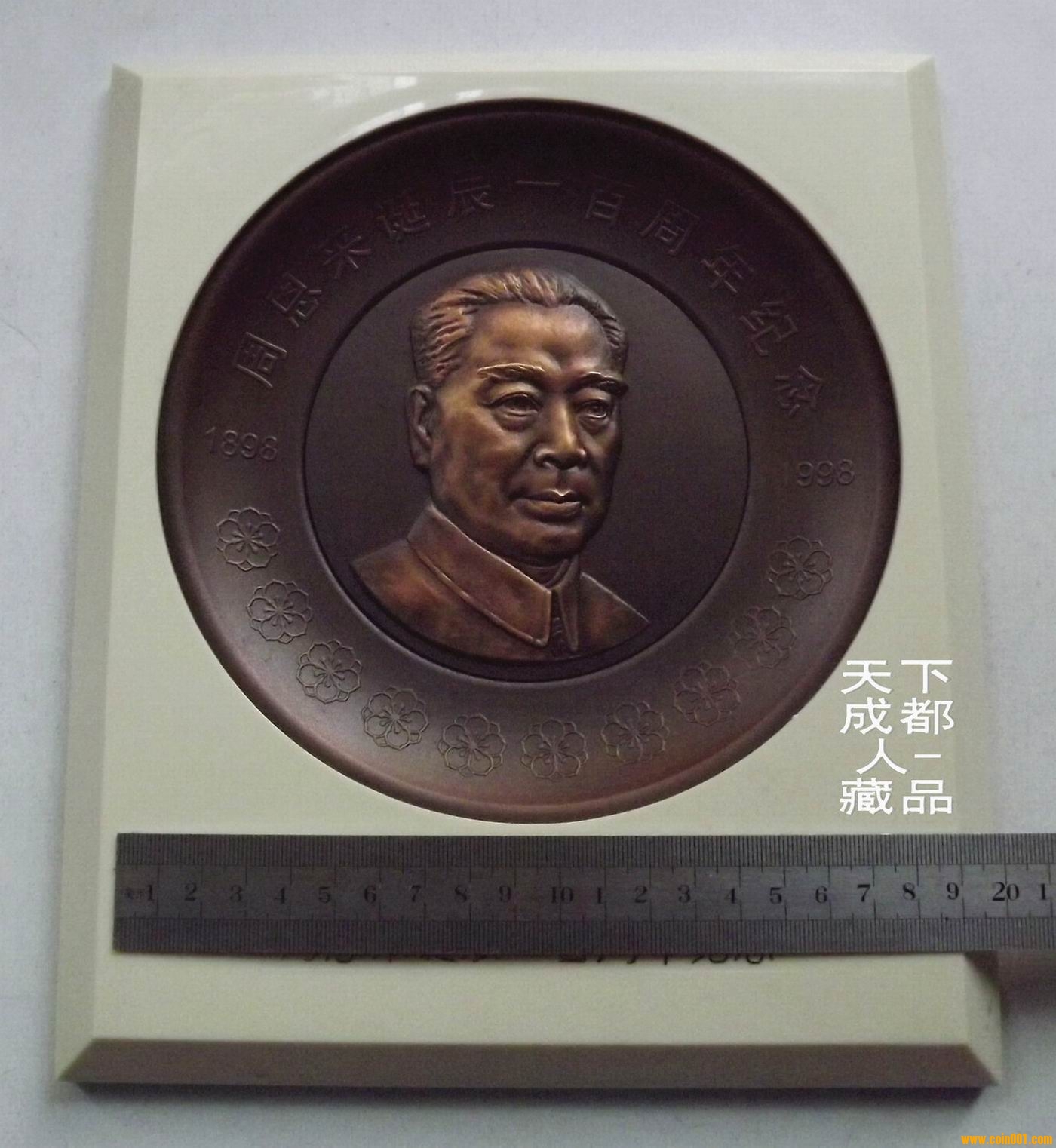 為紀(jì)念周恩來誕辰百年,1997年由中央文獻(xiàn)出版社監(jiān)制、上海造幣廠特鑄《周恩來誕辰百年紀(jì)念盤形精制大銅章》原像框禮盒配證帶支架;材質(zhì)紫銅古銅色、盤形高浮雕技法雕刻精制工藝、外圓直徑180毫米,內(nèi)圓直徑110毫米。該紀(jì)念盤大銅章特邀中央文獻(xiàn)研究室主任、原周總理辦公室副主任:李琦為監(jiān)制人、中央文獻(xiàn)出版社:覃德山設(shè)計、高級工藝美術(shù)大師:童友明手工雕刻,限鑄1萬只。