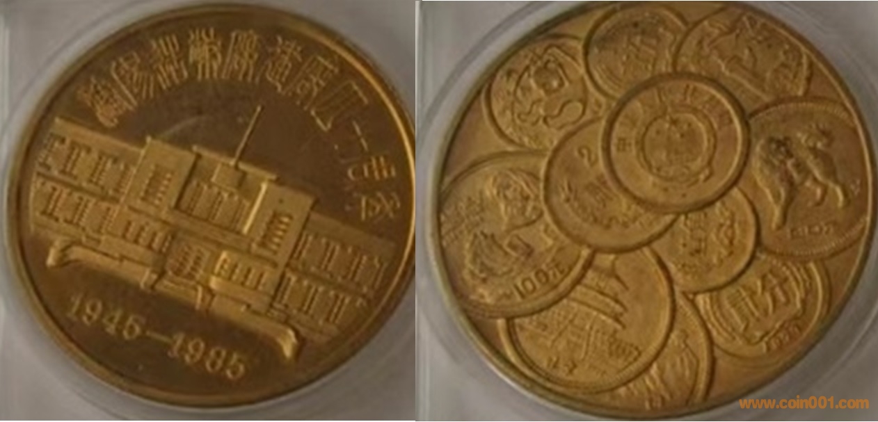 1985年制造,黃銅精制,40mm,沈幣發(fā)行。正面為沈幣大樓,反面為長(zhǎng)城幣,金銀幣疊幣圖。