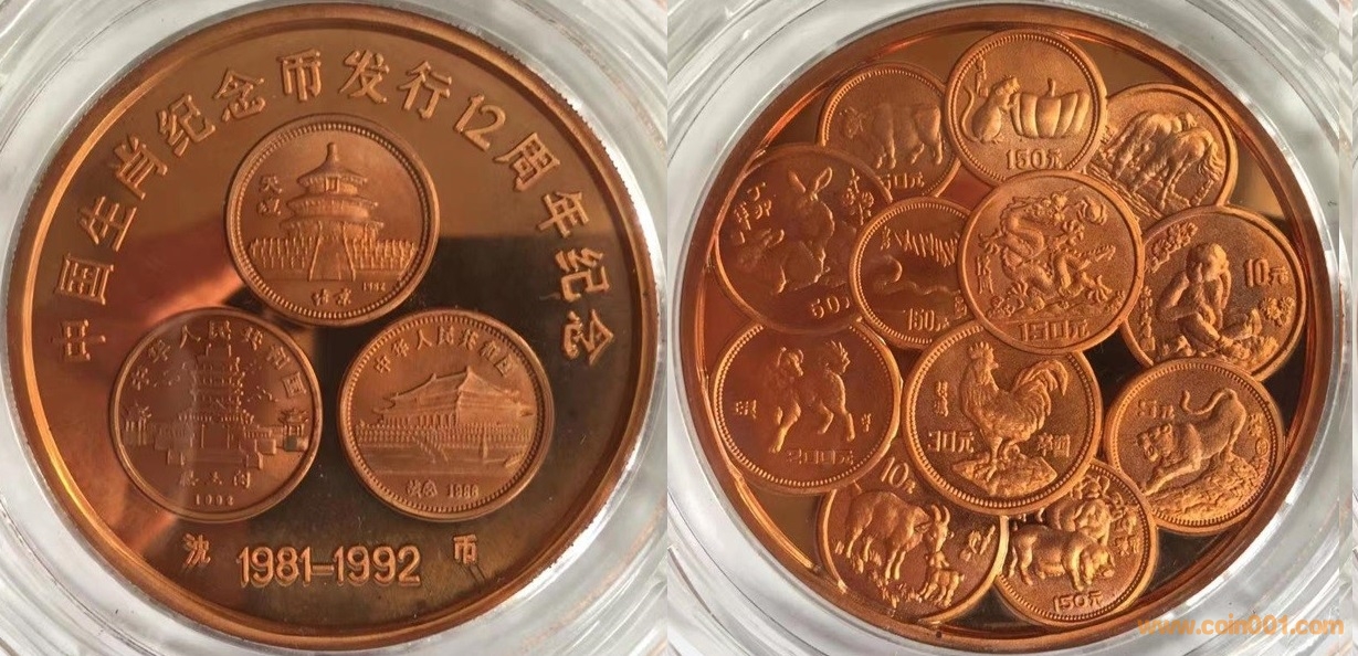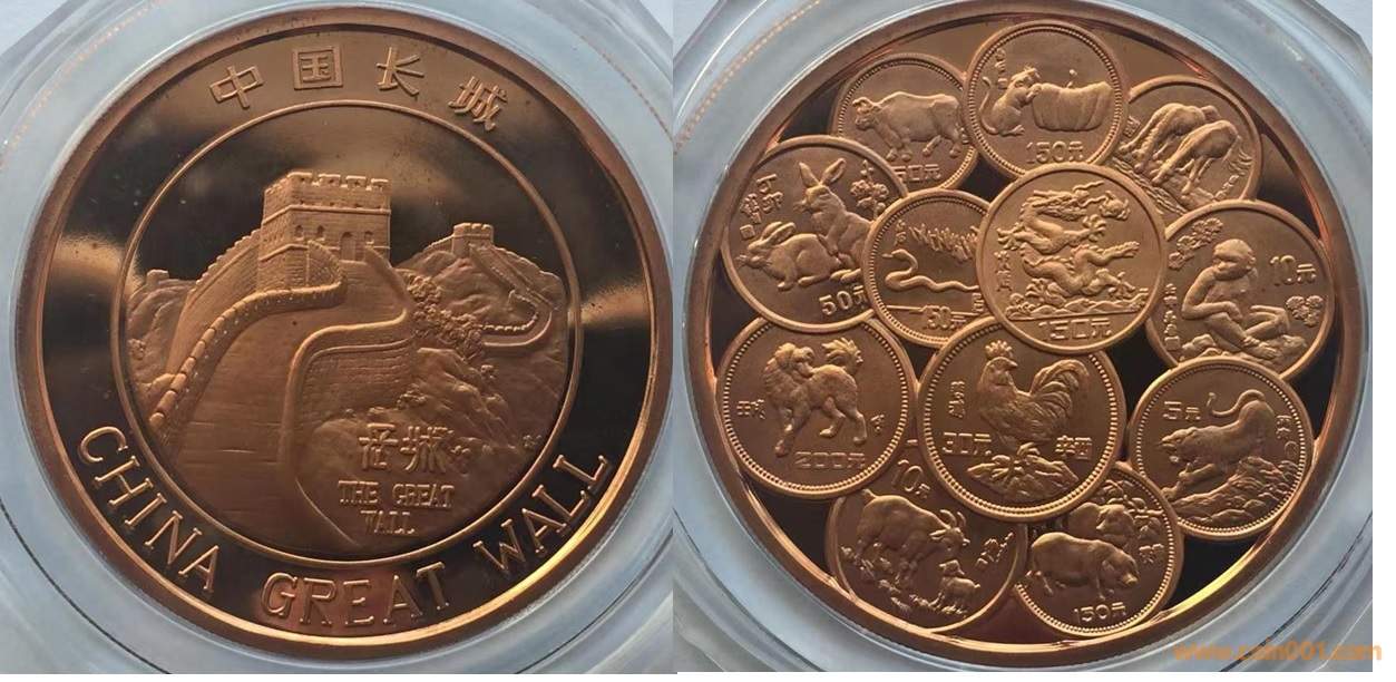 90年代制造,紫銅精制60mm上幣發(fā)行。正面為長(zhǎng)城,反面為生肖金銀幣疊幣圖。這枚章目前為孤品。