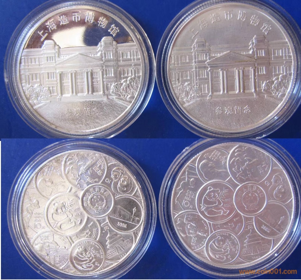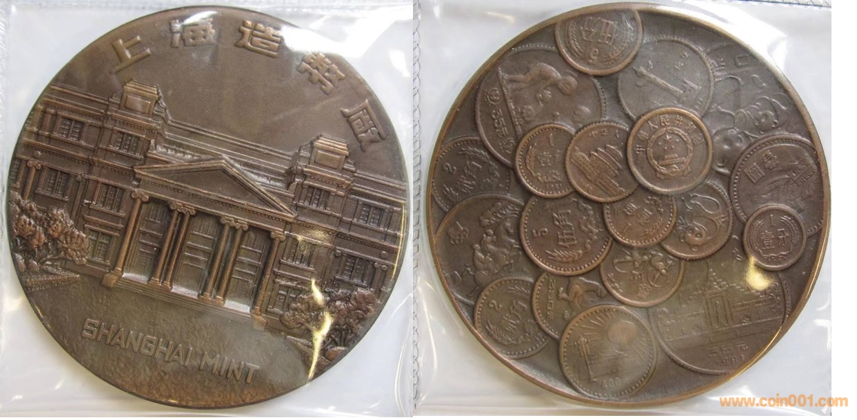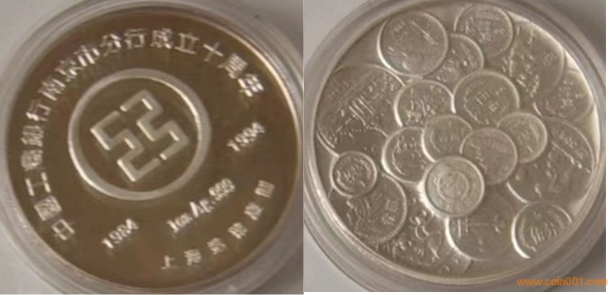 1984年制造,60mm,上幣發(fā)行。正面為上幣大樓,反面為熊貓疊幣、金銀幣疊幣、建三五疊幣以及長(zhǎng)城幣疊幣圖。
