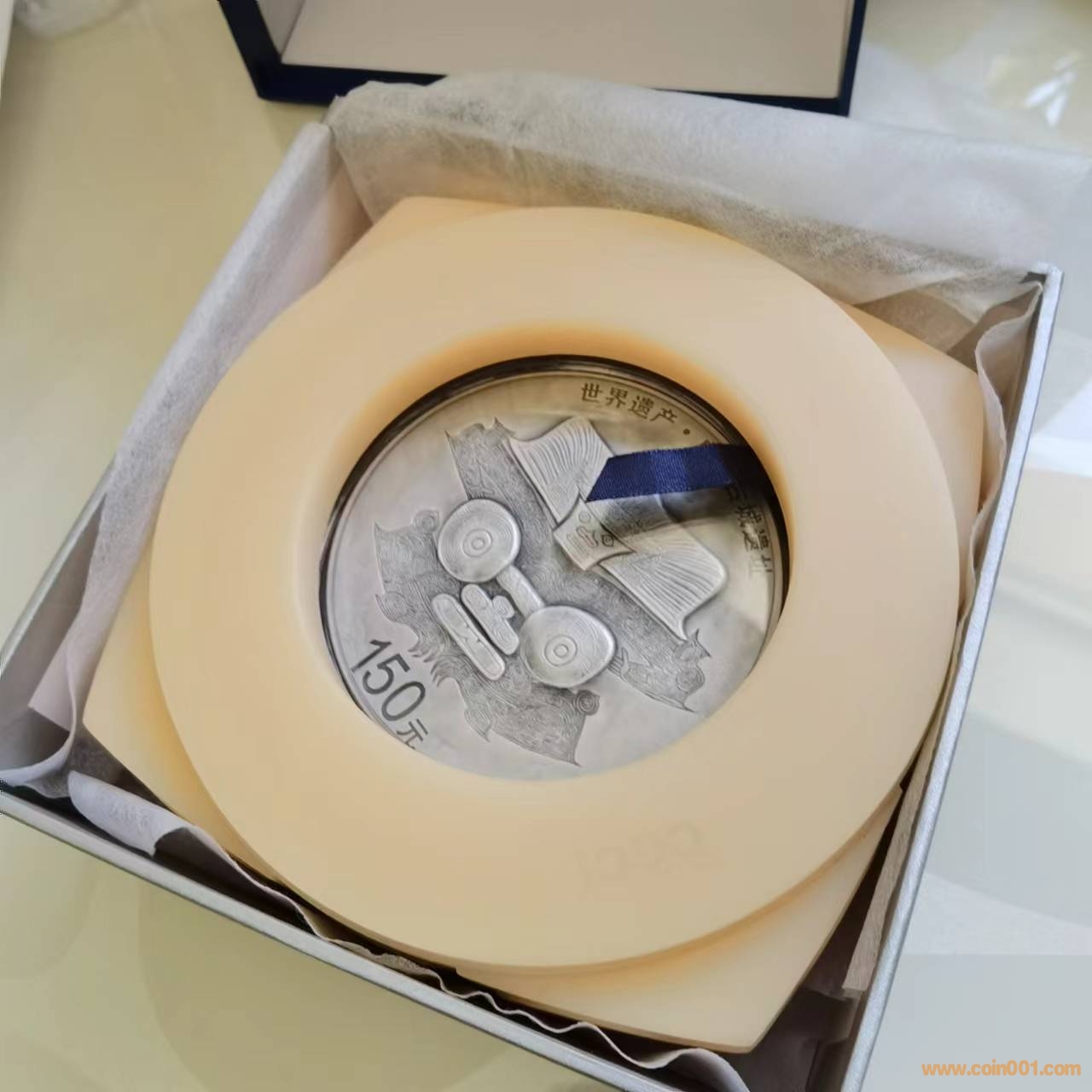 出2枚良渚古城遺址(世界遺產(chǎn))原盒500克圓形銀幣。