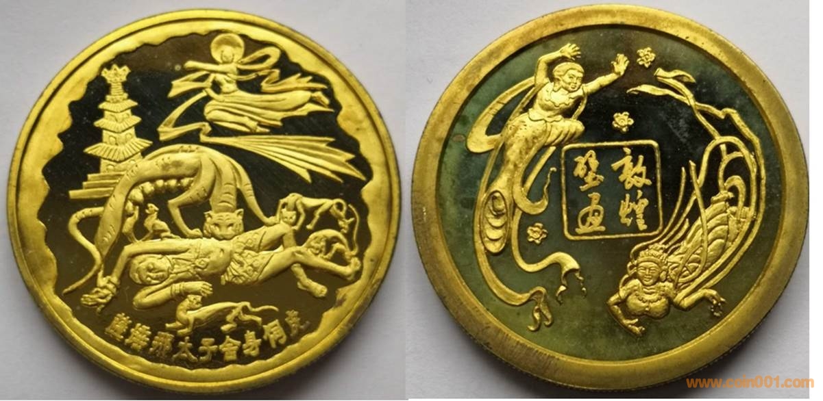 1987年制造,黃銅精制。正面為舍身飼虎圖,反面為飛天圖。