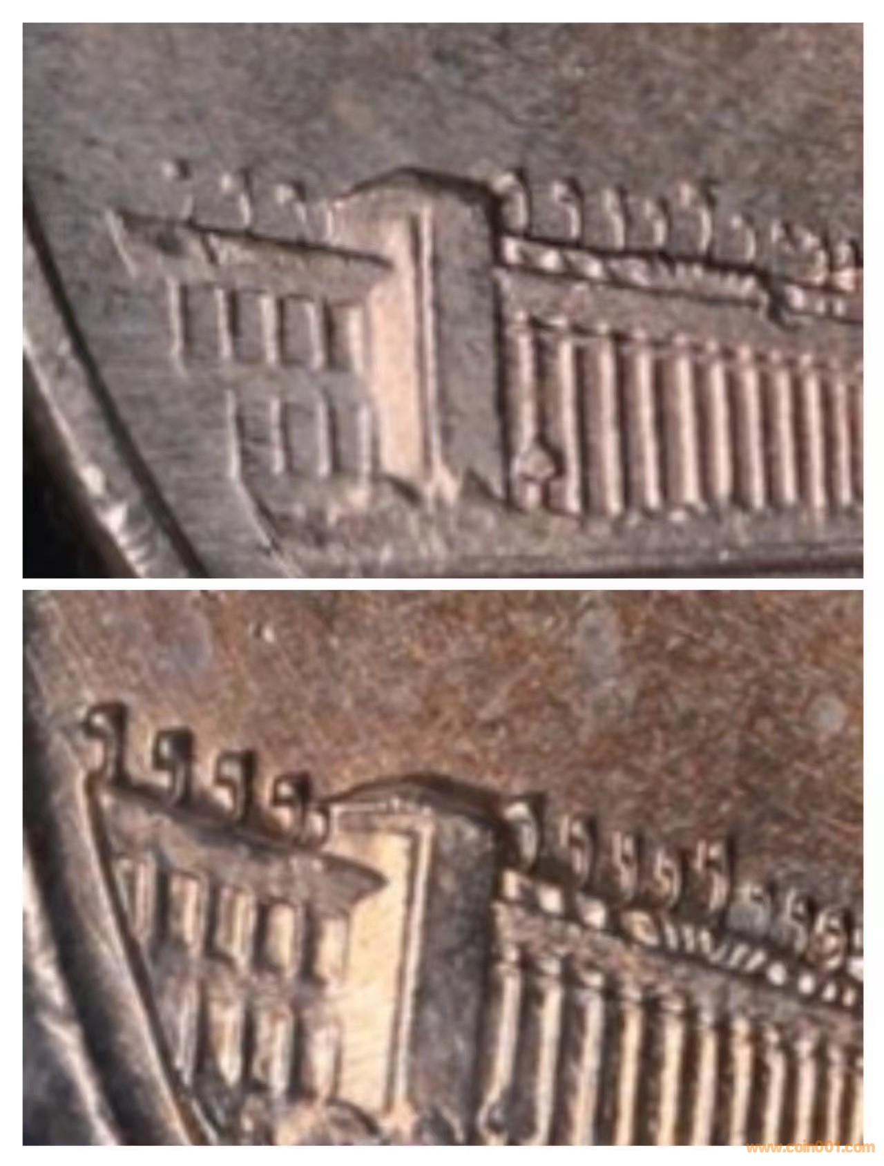 這就是人們常??吹降娜醮驇努F(xiàn)象,由于模具快速高壓壓印過程中的磨損導(dǎo)致圖文凹槽變淺直到消失或凹槽賭賽等原因?qū)е?,有時(shí)候是壓力不足導(dǎo)致,這些屬于弱打的錯(cuò)鑄幣范疇!幣本身完全沒有任何真假問題!