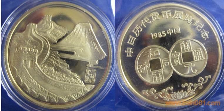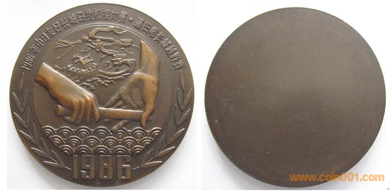 1985年制造,33mm,上幣發(fā)行。正面為長城及富士山,反面為中日貨幣圖案。