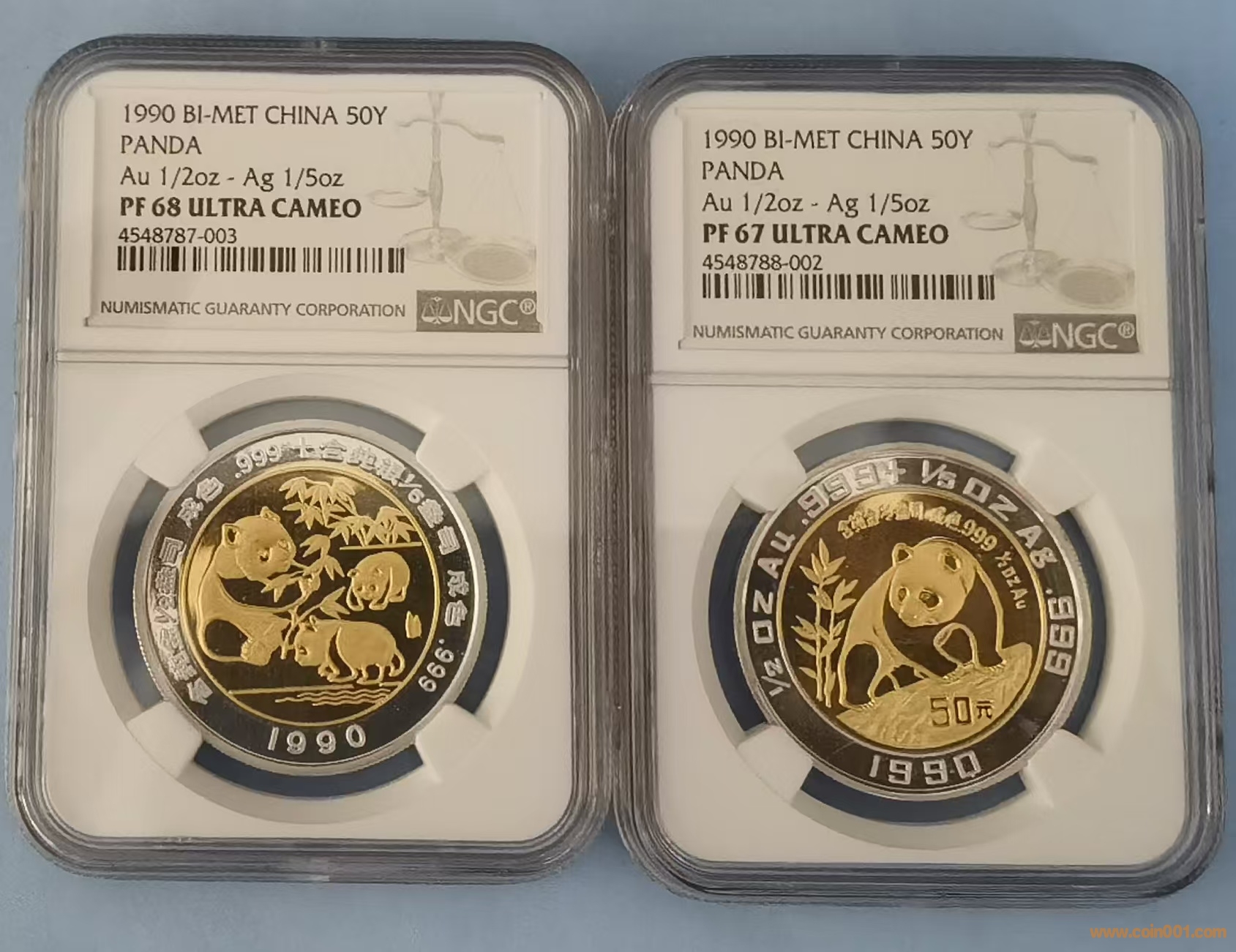 中國現(xiàn)代貴金屬第一套雙金屬紀(jì)念章幣(1990年第三屆香港錢幣展覽會(huì)熊貓玩水章+熊貓伏巖幣