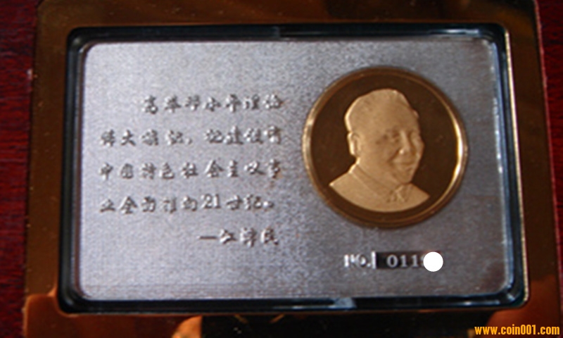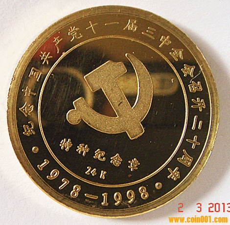 本章含純金11.3克,純銀20克,是為紀(jì)念11屆三中全會(huì)召開20周年特發(fā),限量發(fā)行19980枚,00001號(hào)由國(guó)家收藏。該章設(shè)計(jì)精美,簡(jiǎn)潔大方,正面是改革開放總設(shè)計(jì)師鄧小平肖像,背面是“黨徽”及24K純金標(biāo)志。由于發(fā)行方式特殊,該章真品市場(chǎng)極少。