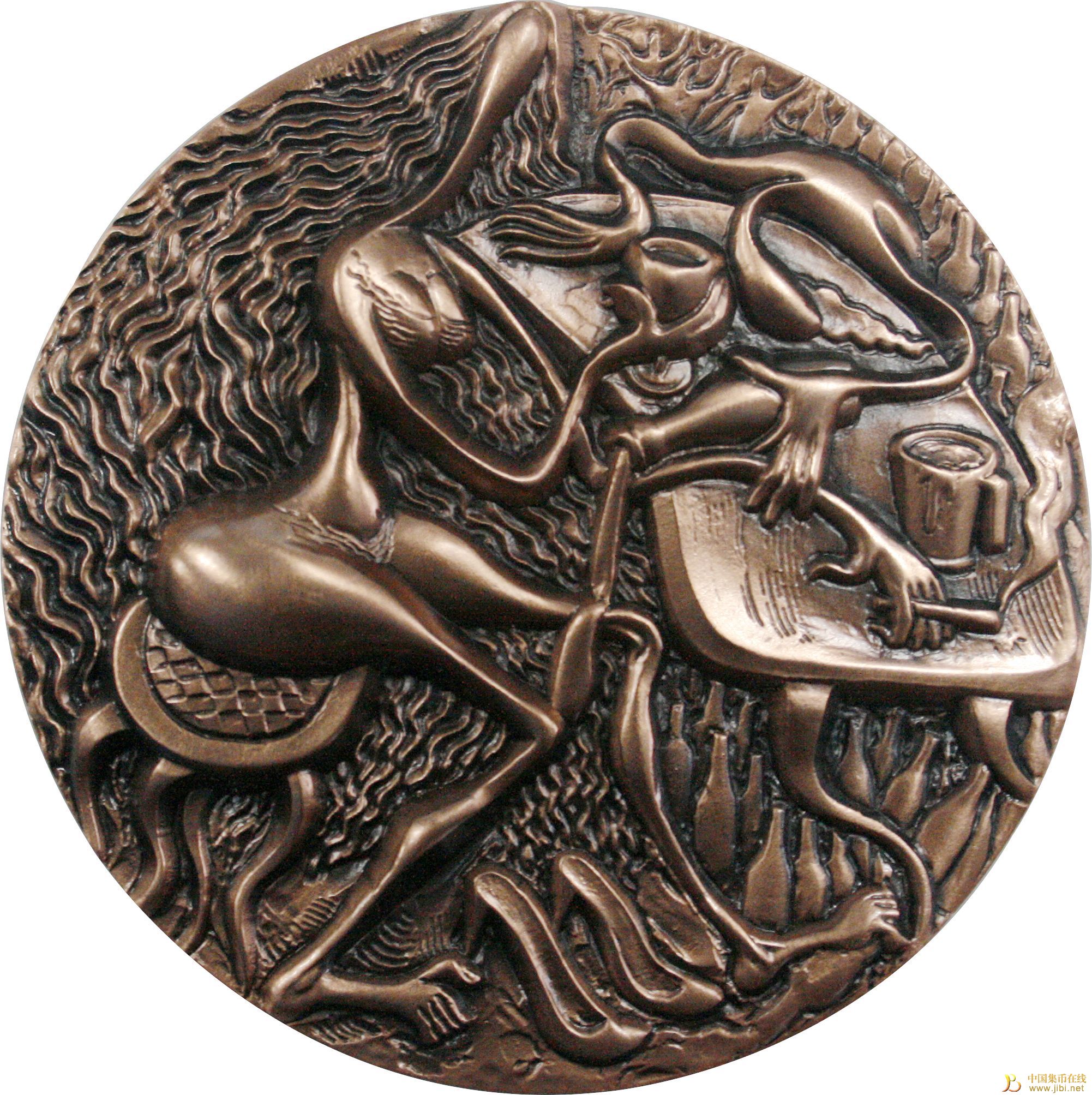“酒吧”系列大銅章一組兩枚,“酒吧”(一)大銅章,正面圖案:酒吧一角符號(hào)化、性征化的醉酒男女特寫(xiě),背景為噪雜的人群影像和鋪天蓋地的酒瓶;背面圖案:為正面圖案的虛幻表達(dá)?!熬瓢伞保ǘ┐筱~章,正面圖案:以細(xì)膩而真實(shí)的筆觸再現(xiàn)了酒吧里一對(duì)緊緊相擁的年輕人;背面圖案:為正面圖案的虛幻表達(dá)。