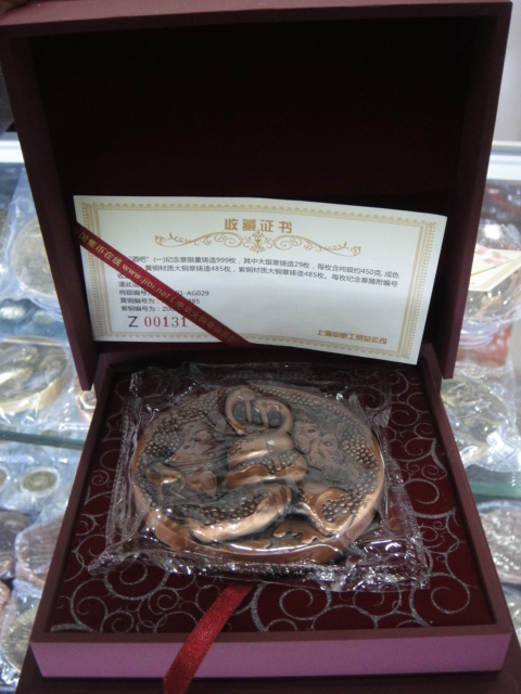兩枚大銅章直徑80毫米,總發(fā)行量均為999枚,其中大銀章29枚,每枚含純銀約450克,成色99.9%;黃銅章與紫銅章各為485枚。