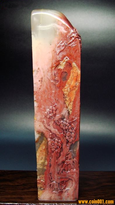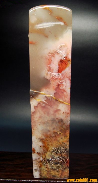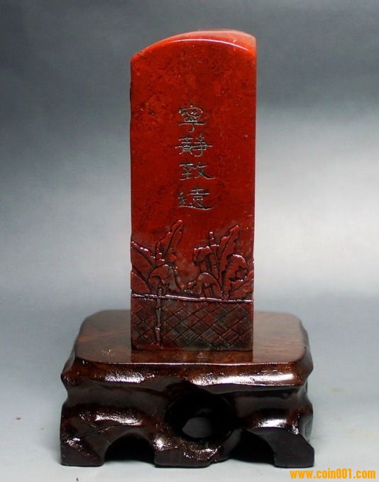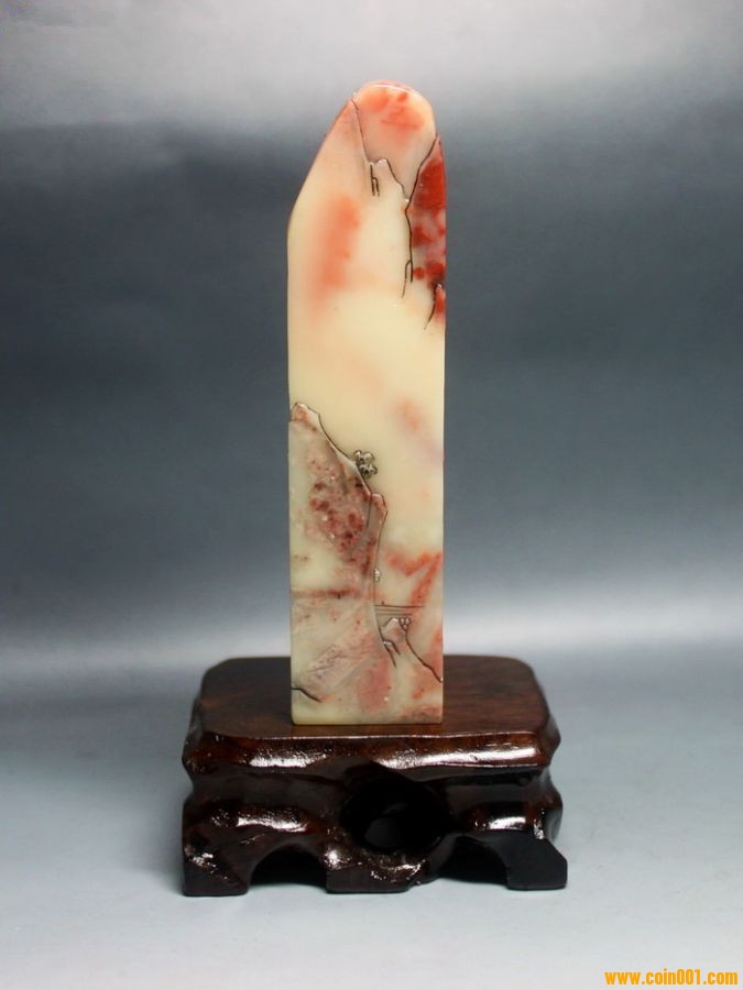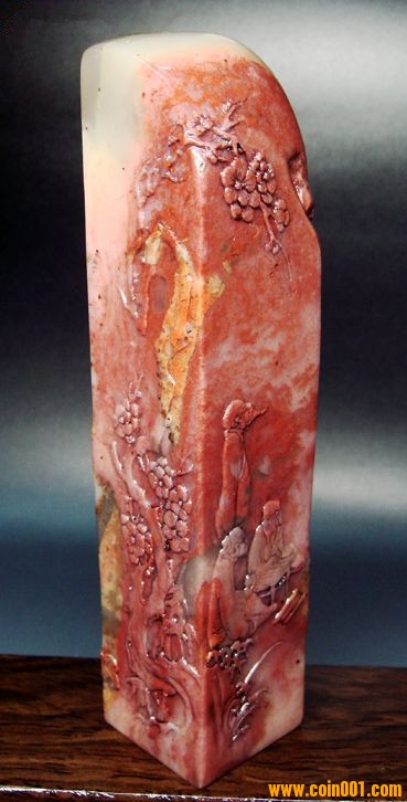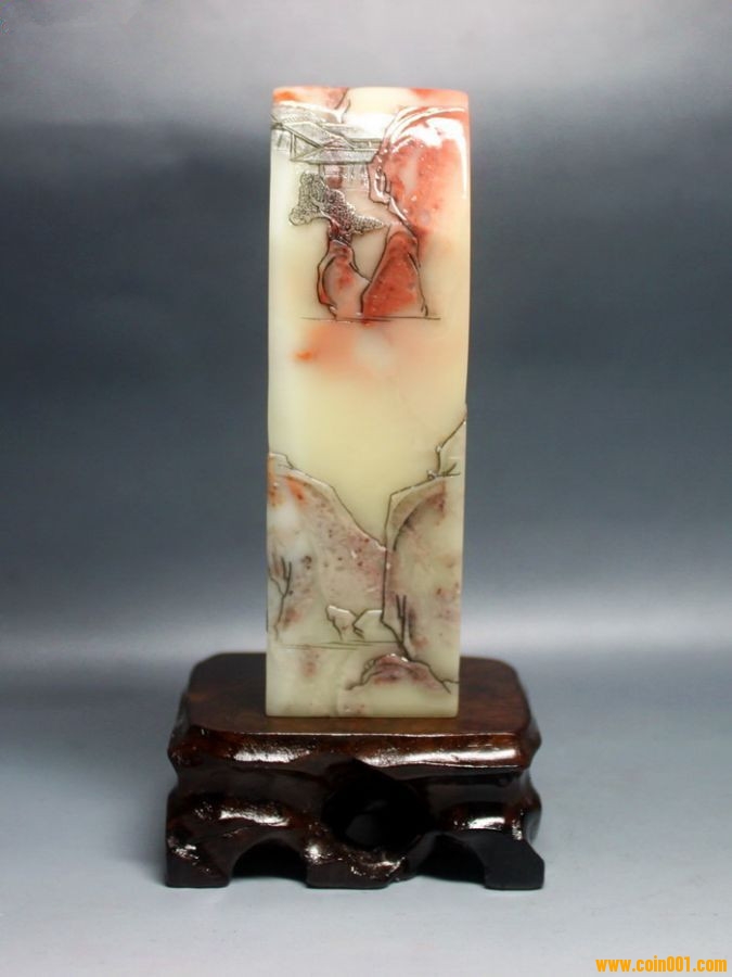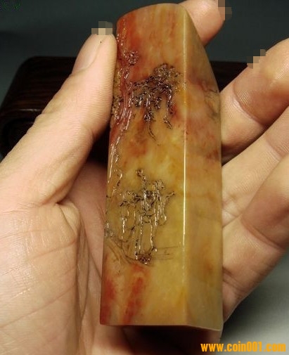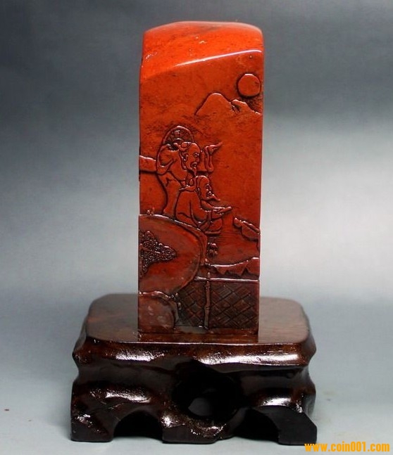 (2)壽山石印章之高山凍石山水人物薄意大章,沒(méi)有缺陷,章高:13.0公分,章面:2.9公分*2.9公分,這么大的尺寸很難得;壽山石之高山凍石,質(zhì)地很好,很大面積帶有凍質(zhì),非常難得;石性穩(wěn)定,手工雕刻,雕工不錯(cuò),三包天然壽山石,包石頭天然原色;刻劃人物傳神,石質(zhì)溫潤(rùn)熟美,章料彰顯大氣,文雅之士必備用品,價(jià)格:980元,具體圖片請(qǐng)看二樓的圖片,圖片是在晚上燈光下拍的,顏色顯得亮,實(shí)物紅色部分的顏色是深紅色。