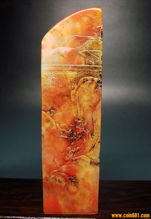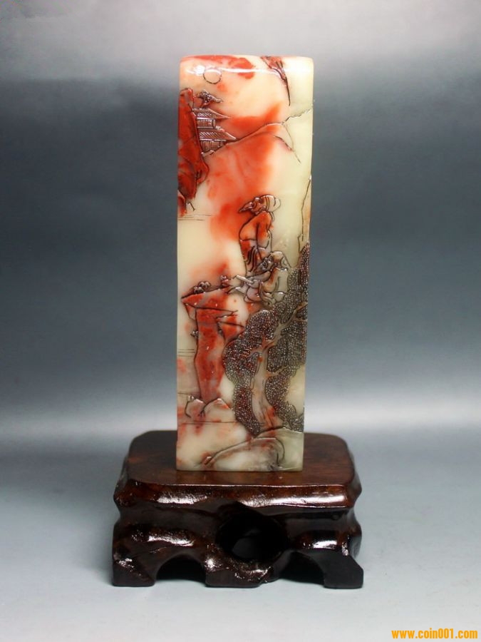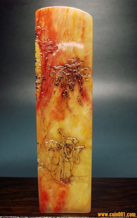 (5)壽山石精雕印章之山居訪友人物長(zhǎng)形大章,沒(méi)有缺陷,印章高約13.2公分,印面長(zhǎng)寬2.7公分,這么大的尺寸很難得;壽山高山系材質(zhì),紅黃白灰俏色鏟雕技藝精湛,刻劃人物傳神,石質(zhì)溫潤(rùn)熟美,章料彰顯大氣,文雅之士必備用品,質(zhì)地很好,色澤漂亮,石性穩(wěn)定,手工雕刻,三包天然壽山石,包石頭天然原色,價(jià)格:880元,具體圖片請(qǐng)看五樓的圖片。