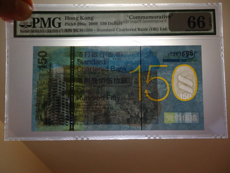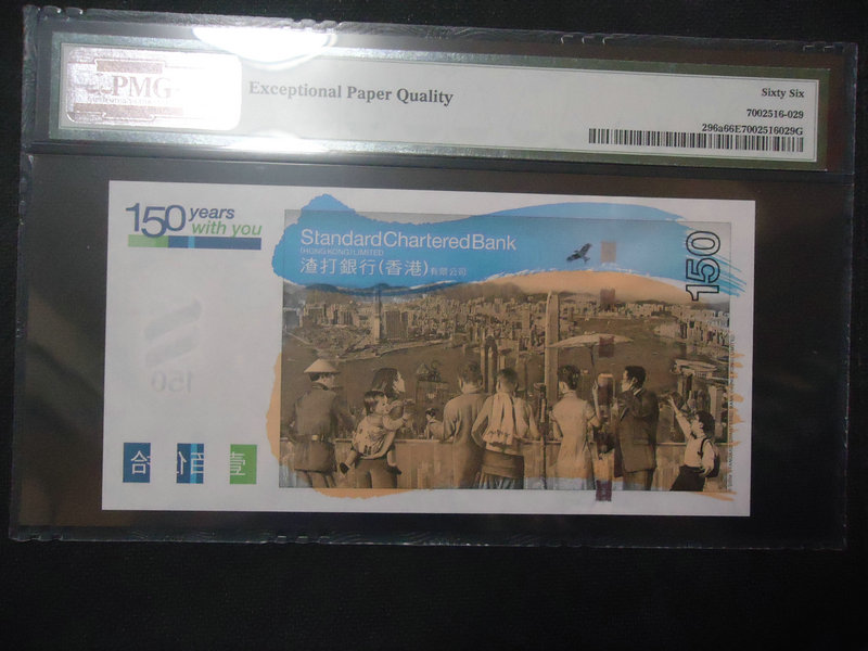香港渣打150周年紀(jì)念鈔150元PMG評級幣、150元這個面值再全球都少見,發(fā)行量本來預(yù)計(jì)是75萬張的,結(jié)果設(shè)計(jì)印刷出來,票的背面打電話的男人是一個手6個手指的,所謂錯版鈔,只發(fā)行了10萬張就全部停止發(fā)行了,和雙龍鈔一樣的發(fā)行量。