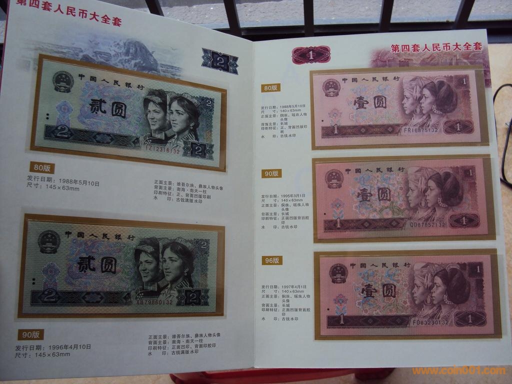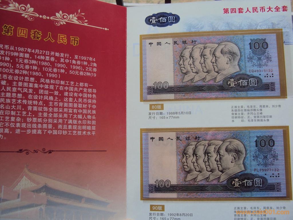 1)80版+90版100元劵各一枚;(2)80版+90版50元劵各一枚;80版50元(第四人民幣鈔王,罕見)(3)80版10元劵一枚;(4)80版5元劵一枚;(5)80版+90版2元劵各一枚;(6)80版+90版+96版1元劵各一枚;(7)80版五角劵一枚;(8)80版兩角劵一枚;(9)80版一角劵一枚;最大特點:中國人民銀行發(fā)行的第四套人民幣全套九種劵別“末三位”數(shù)字編號全部相同(10)紙分幣三張
