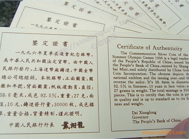 1996年 26屆奧運(yùn)會(huì)-帆板 重量 27克 鑄30000枚 帶證書(shū)不是10連號(hào) 6連號(hào)其他4張不連 3500元包ESM