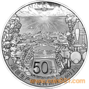 155.52克(5盎司)圓形銀質(zhì)紀(jì)念幣背面圖案為兵團(tuán)60年建設(shè)輝煌成就,并刊“新疆生產(chǎn)建設(shè)兵團(tuán)成立60周年”中文字樣及面額。