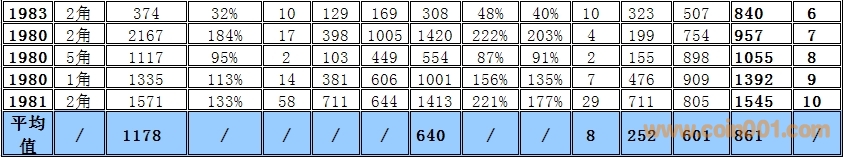 備:這個(gè)采樣的范圍會(huì)有一定的誤差,我將根據(jù)均值比的變化每個(gè)季度第一周進(jìn)行適當(dāng)?shù)恼{(diào)整,由于普制長(zhǎng)城幣的版別比較復(fù)雜,無法進(jìn)行細(xì)分這里主要以年份為主,請(qǐng)大家諒解!
