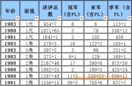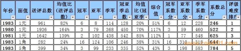普制長(zhǎng)城幣評(píng)級(jí)難度排序與早期分幣難度排序有明顯的區(qū)別,為了能體現(xiàn)難度系數(shù)的準(zhǔn)確性和科學(xué)性在計(jì)算時(shí)考慮的因素相對(duì)要復(fù)雜一些,主要參考了評(píng)級(jí)的總數(shù),均值比(送評(píng)總數(shù)),冠亞季軍總數(shù),均值比(冠亞季總數(shù))等數(shù)據(jù)作為計(jì)算的主要依據(jù),同時(shí)各個(gè)均值段的補(bǔ)償方法也比較復(fù)雜