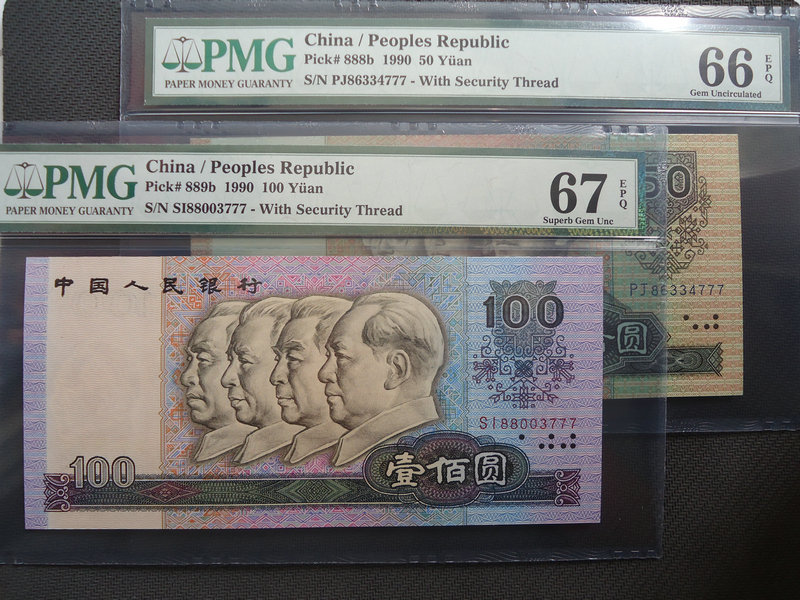 PMG 90100 SI 88003777=67分+PMG 9050 PJ 86334777=66元,1600元!一對(duì)尾3同豹子號(hào)777.