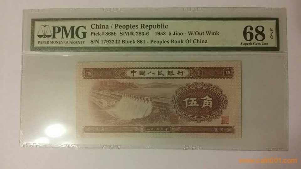 1953年,二版伍角水霸,1792242,PMG,68,EPQ          1500元