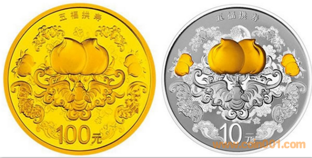 7.776克(1/4盎司)圓形金質(zhì)紀(jì)念幣背面圖案為壽桃、蝙蝠造型,襯以吉祥花卉等圖案組合設(shè)計(jì),并刊“五福拱壽”字樣及面額。