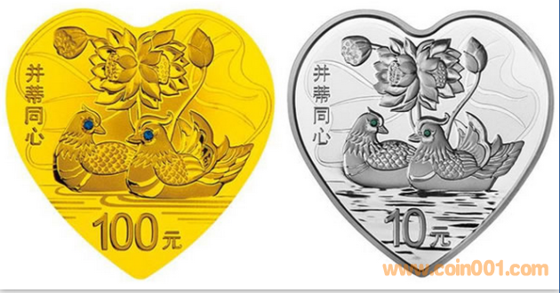 31.104克(1盎司)心形銀質(zhì)紀(jì)念幣背面圖案為鴛鴦、并蒂蓮造型,襯以裝飾荷葉紋樣組合設(shè)計(jì),并刊“并蒂同心”字樣及面額。