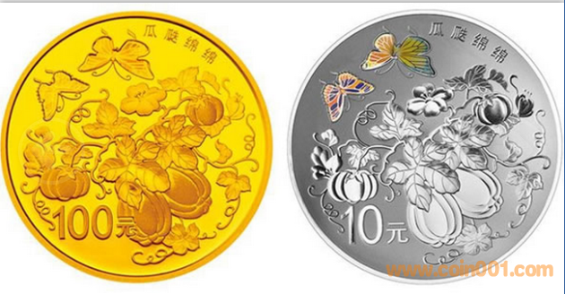 7.776克(1/4盎司)圓形金質(zhì)紀(jì)念幣背面圖案為南瓜、藤蔓以及蝴蝶造型組合設(shè)計(jì),并刊“瓜瓞綿綿”字樣及面額。