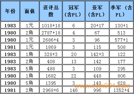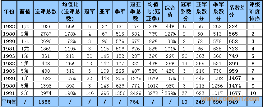 普制長城幣評級難度排序2015-3 普制長城幣評級難度排序與早期分幣難度排序有明顯的區(qū)別,為了能體現(xiàn)難度系數(shù)的準確性和科學(xué)性在計算時考慮的因素相對要復(fù)雜一些,主要參考了評級的總數(shù),均值比(送評總數(shù)),冠亞季軍總數(shù),均值比(冠亞季總數(shù))等數(shù)據(jù)作為計算的主要依據(jù),同時各個均值段的補償方法也比較復(fù)雜 首先我們需要討論評級幣的價格構(gòu)成 評級幣的價格構(gòu)成 裸幣的價格+評級溢價+評級費用=評級幣的參考價格 主要可以參考以下2個因數(shù), 第一個因素為裸幣本生的價格(它的價格變動主要依據(jù)裸幣成交價格的變動而變動與評級溢價之間的關(guān)系不大) 舉例來說: 裸幣的價格上漲1倍評級難度系數(shù)沒有變化的話,評級幣的價格應(yīng)該相應(yīng)的上漲1倍+溢價+評級費用=評級幣的參考價格,裸幣的價格的上漲只能帶動評級幣裸幣部分的上升,裸幣價格下跌,評級難度系數(shù)沒有變化的話,評級幣的價格為裸幣下跌的價格+溢價+評級費用=評級幣的參考價格,裸幣的價格的下跌只能帶動評級幣裸幣部分的下跌 第二個因素為評級難度所產(chǎn)生的一個溢價 難度系數(shù)越高它對應(yīng)的溢價就越高。溢價變化主要依據(jù)評級難度系數(shù)與系數(shù)平均值的變化和對比來決定,溢價水平的上升在一定的程度上會提升高品質(zhì)裸幣的價格(卷光卷拆的硬幣)和品相的稀缺性,裸幣價格的下跌,如果評級難度提高的話評級幣的價格反而有可能會上升,從以上的結(jié)果可以得出下列結(jié)論,溢價是評級價格體系當(dāng)中最重要的組成部分,溢價和裸幣的價格體系完全是獨立的,之間的價格沒有直接的聯(lián)系 備注:關(guān)于這個數(shù)據(jù)的準確性在設(shè)計這個表的時候我已經(jīng)考慮到了一個重評的可能性所以我只取冠,亞,季軍作為一個參考并同時設(shè)計了一個補償方案,重評從時間和金錢的角度來衡量的話不是非常經(jīng)濟且還存在一定的風(fēng)險,但是從長遠看不能排除這個因數(shù)。雖然將來會產(chǎn)生一些誤差,但我認為誤差不會太大尤其在高分段和稀缺性的錢幣,對于普制長城幣來說NGC已經(jīng)作為收藏的主流其數(shù)據(jù)的準確性還是比較值得信賴的。 采樣的范圍 取樣范圍:1980-1985 普制長城幣 難度排序的選擇標(biāo)準:送評總數(shù)的平均值高于100%的普制長城幣,低于100%的數(shù)據(jù)將不體現(xiàn)在難度排序中 計算公式: 評級總數(shù)/均值=均值比 考慮到1983年長城幣存世量明顯低于其他年份的普制長城幣,1983年的數(shù)據(jù)將保留和計入到難度排序中,大家可以通過下面的圖表黃色部分發(fā)現(xiàn)被刪除的年份主要是送評溢價不高的年份,如果未來送評量穩(wěn)步上升的話,它將加入到采樣的范圍. 備:這個采樣的范圍會有一定的誤差,我將根據(jù)均值比的變化每個季度第一周進行適當(dāng)?shù)恼{(diào)整,由于普制長城幣的版別比較復(fù)雜,無法進行細分這里主要以年份為主,請大家諒解! 采樣的數(shù)據(jù)和計算的依據(jù) 統(tǒng)計第一檔次每個年份冠,亞,季的出分數(shù)量作為一個分析依據(jù),為了能更加的量化我用數(shù)字的方法進行統(tǒng)計,方法如下: 調(diào)整后的均值比 普制長城幣的計算方法如下: 綜合值的計算方法: (送評總數(shù)均值比+冠亞季總數(shù)均值比)÷2=綜合值 具體計算方法如下: 均值比在0-50% 冠軍分1枚為1分2枚2分以此類推,亞軍分1枚為2分2枚4分以此類推,季軍1枚為3分2枚6分以此類推 補償方法如下: 如果冠軍分的評分數(shù)量大于總數(shù)(冠,亞,季之和)的15%,冠軍分的1枚為1.5分,如果冠軍分的評分數(shù)量大于總數(shù)(冠,亞,季之和)的50%冠軍分的1枚為2分 如果亞軍分的評分數(shù)量大于總數(shù)(冠,亞,季之和)的35%,亞軍分的1枚為2.5分,如果亞軍分的評分數(shù)量低于總數(shù)(冠,亞,季之和)的25%亞軍分的1枚為1.5分 季軍分的評分數(shù)量大于總數(shù)(冠,亞,季之和)的65%,季軍分的1枚為2.5分, 季軍分的評分數(shù)量大于總數(shù)(冠,亞,季之和)的85%,季軍分的1枚為2分 均值比在50-100% 冠軍分1枚為1分2枚2分以此類推,亞軍分1枚為1.5分2枚3分以此類推,季軍1枚為2分2枚4分以此類推 此范圍+值補償 如果冠軍分的評分數(shù)量大于總數(shù)(冠,亞,季之和)的50%冠軍分的1枚為1.25分 如果亞軍分的評分數(shù)量大于總數(shù)(冠,亞,季之和)的35%,亞軍分的1枚為1.75分 均值比在100-150% 冠軍分1枚為0.5分2枚1分以此類推,亞軍分1枚為1分2枚2分以此類推,季軍1枚為1.5分2枚3分以此類推 補償方法如下: 如果冠軍分的評分數(shù)量大于總數(shù)(冠,亞,季之和)的15%,冠軍分的1枚為0.75分,如果冠軍分的評分數(shù)量大于總數(shù)(冠,亞,季之和)的50%冠軍分的1枚為1分 如果亞軍分的評分數(shù)量大于總數(shù)(冠,亞,季之和)的35%,亞軍分的1枚為1.25分,如果亞軍分的評分數(shù)量低于總數(shù)(冠,亞,季之和)的25%亞軍分的1枚為0.75分 季軍分的評分數(shù)量大于總數(shù)(冠,亞,季之和)的65%,季軍分的1枚為1.25分, 季軍分的評分數(shù)量大于總數(shù)(冠,亞,季之和)的85%,季軍分的1枚為1分 均值比在150%-180% 冠軍分1枚為0.5分2枚1分以此類推,亞軍分1枚為0.75分2枚1.5分以此類推,季軍1枚為1.25分2枚2.5分以此類推 如果冠軍分的評分數(sh