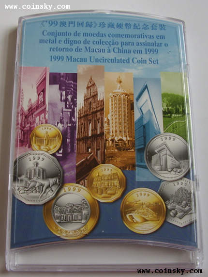 (1)商品全稱為“《’99澳門回歸》珍藏硬幣紀(jì)念套裝”,原盒塑封,一套七枚,內(nèi)盒印“澳門貨幣暨匯兌監(jiān)理署”字樣,含澳門幣拾圓、伍圓、貳圓、壹圓、伍毫、貳毫、壹毫硬幣各一枚;