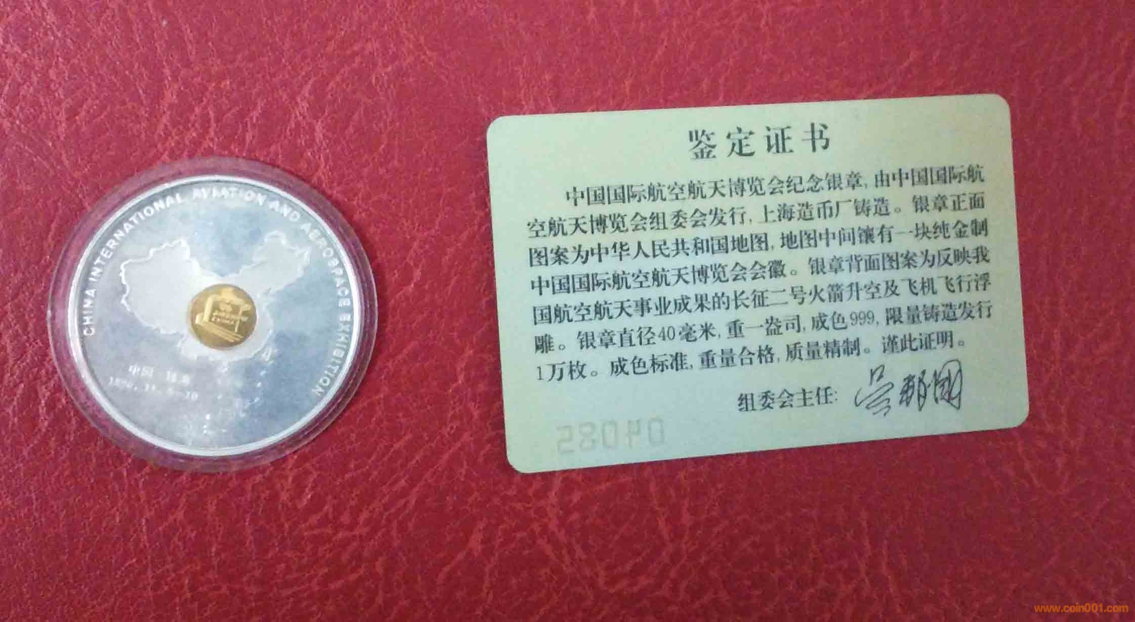 中國國際航空航天博覽會紀念章,由中國國際航空航天博覽會組委會發(fā)行,上海制造廠鑄造。銀章正面圖案為中華人民共和國地圖,地圖中間鑲有一塊純金制中國國際航空航天博覽會會徽。銀章背面圖案為反映我國航空航天事業(yè)成果的長征二號火箭升空及飛機飛行浮雕。銀章直徑40毫米,重一盎司,成色999,限量鑄造發(fā)行1萬枚。