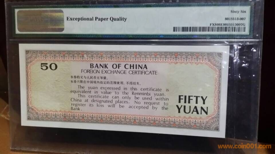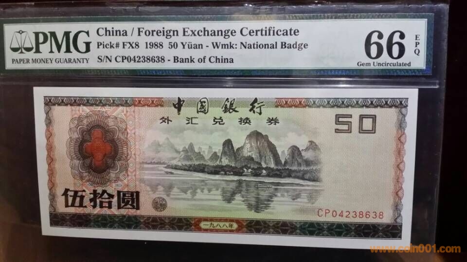 1)1988年,中國(guó)銀行外匯兌換券伍拾圓,CP,04238638,PMG,66,EPQ       3900元
