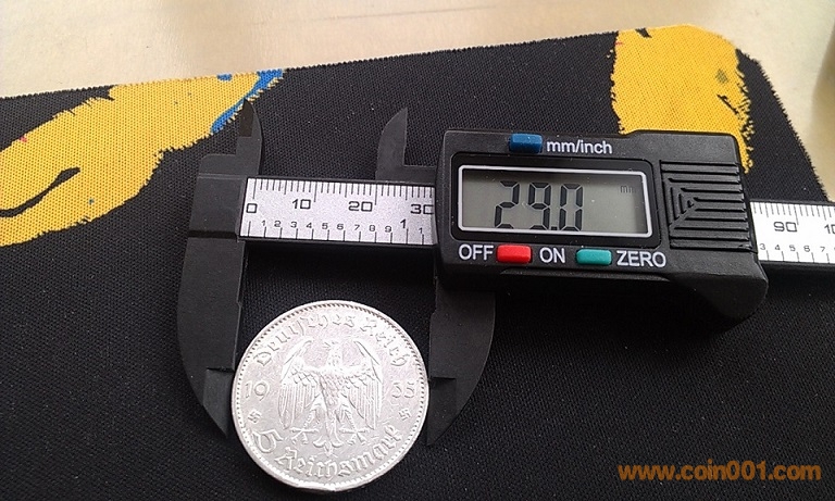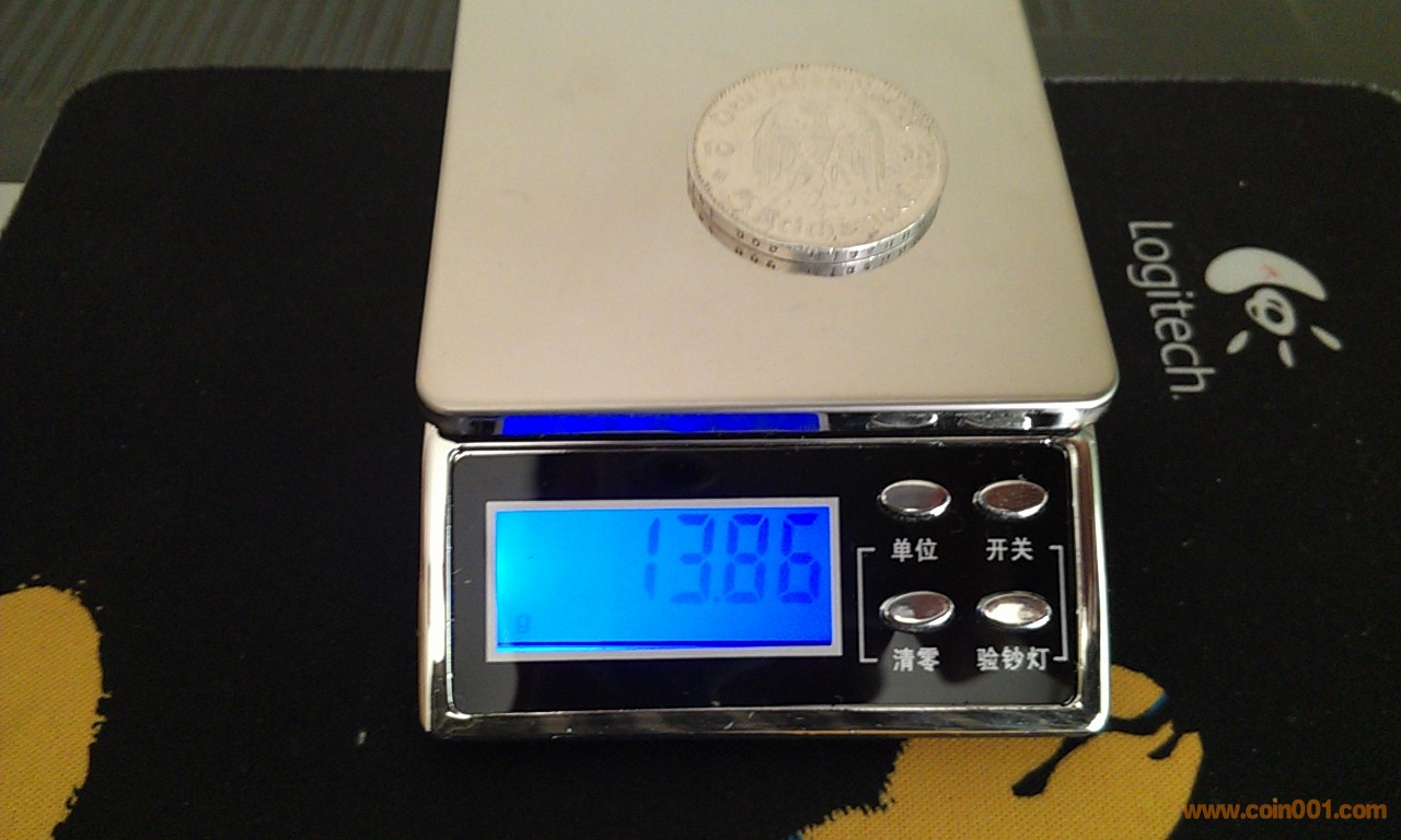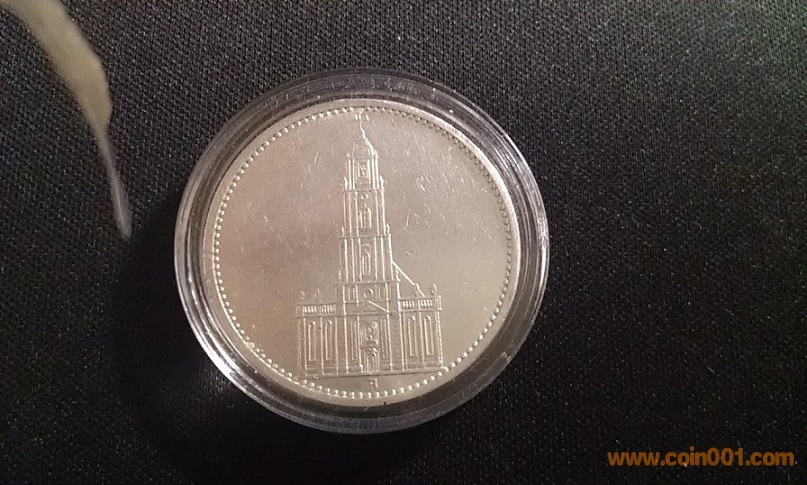 直徑29.0mm,重量13.88Grams,含銀量90.0 %。1935年發(fā)行,面值5馬克,稀少品種,紀(jì)念納粹上臺(tái)一周年,鑄造量遠(yuǎn)小于后來(lái)的1936-1938年5馬克銀幣,正面有兩個(gè)納粹標(biāo)志,絕對(duì)保真,送塑料小圓盒。 納粹黨自1933年開始執(zhí)政,1934年開始發(fā)行印有納粹標(biāo)志的銀幣,直至1936年才開始大量發(fā)行具有明顯納粹標(biāo)志的硬幣,帝國(guó)戰(zhàn)鷹握住萬(wàn)字花環(huán)的標(biāo)志出現(xiàn)在正面。1939年二戰(zhàn)正式爆發(fā)后,戰(zhàn)爭(zhēng)資源緊張,再也沒有鑄造過大面額的納粹馬克銀幣。小面額芬尼硬幣也停止使用superior metals鑄造。1940年以后,幾乎所有的小面額硬幣都以鋅為主要鑄造金屬,唯一的例外是50芬尼硬幣,仍以鋁為主要鑄造金屬。絕大多數(shù)帶有納粹標(biāo)志 銅、鋅、鋁硬幣,在戰(zhàn)后,又被收繳,重新送回鑄幣廠,在它們被鑄造的地方,被回爐銷毀。再加上大量的硬幣,在戰(zhàn)亂中即被損毀,所以存世量不大,具有收藏和歷史研究?jī)r(jià)值.