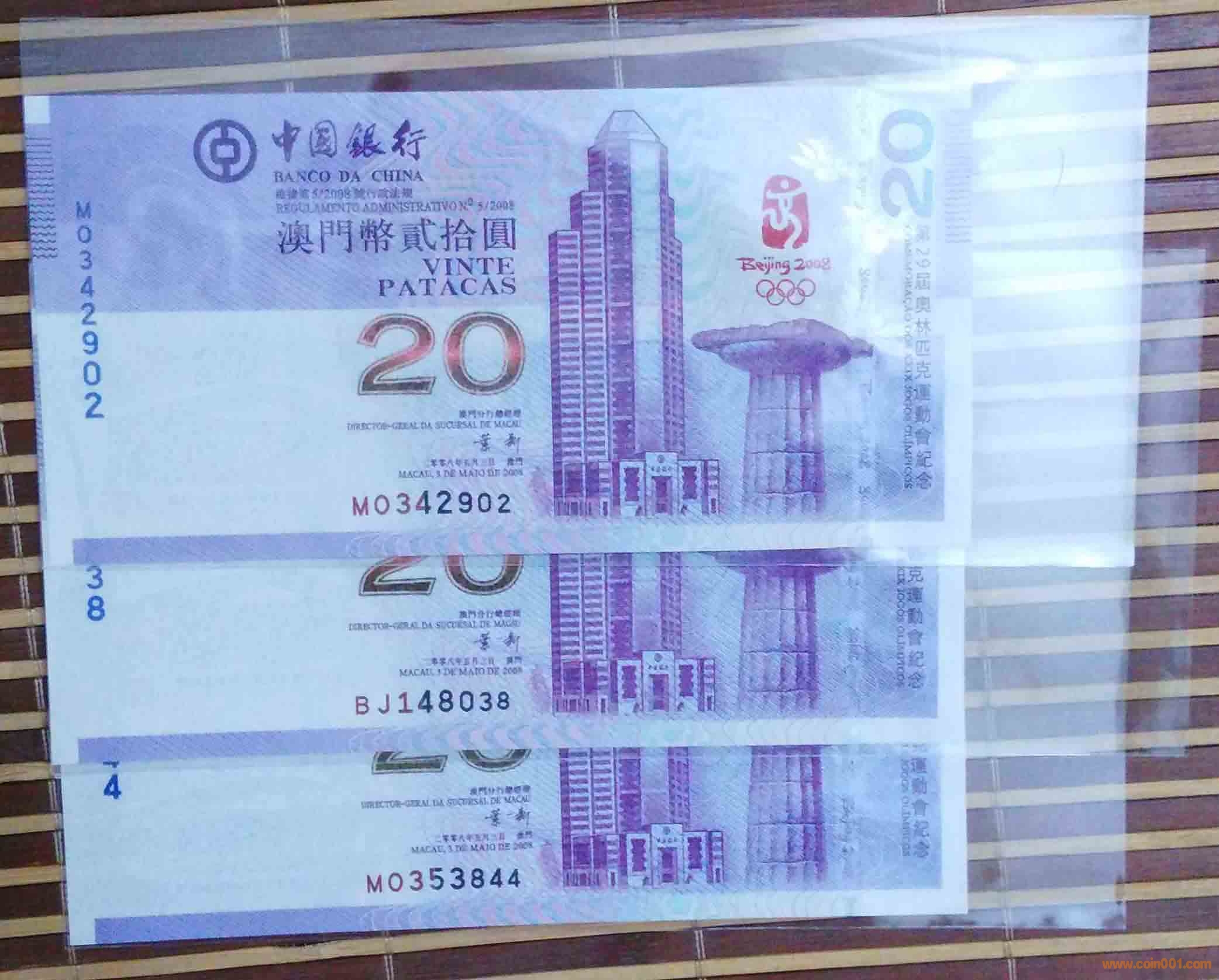 2)2008年澳門奧運(yùn)鈔貳拾圓:MO,342902-BJ,148038-MO,353844,1420元X3張