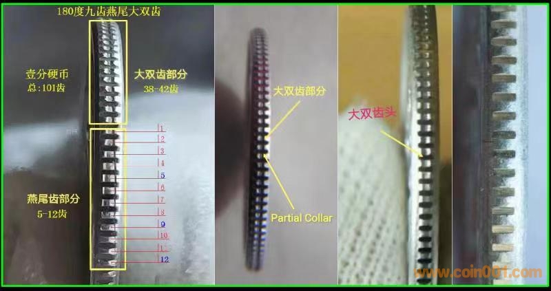 131大雙齒獨特的形成原理,可以當成版別幣來看待,也可以當成錯鑄幣來看待。大雙齒與普通正常邊齒的對比。